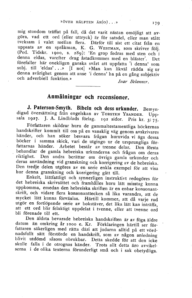 Full resolution (TIFF) - On this page / på denna sida - Häfte 6 - Ivar Belanner. »Över hälften är(o)...» - Anmälningar och recensioner - Oscar Bensow. J. Paterson—Smyth. Bibeln och dess urkunder