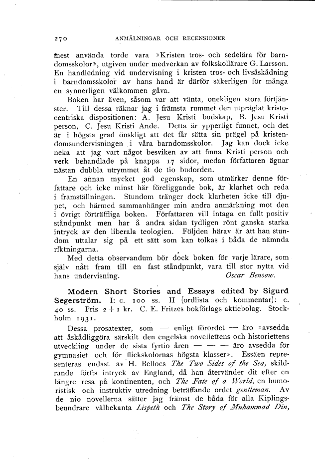 Full resolution (TIFF) - On this page / på denna sida - Häfte 8 - Anmälningar och recensioner - Oscar Bensow. H. Steen. Handledning vid undervisning i kristen tros- och livsåskådning i barndomsskolor - Arne von Koch. Modern Short Stories and Essays edited by Sigurd Segerström