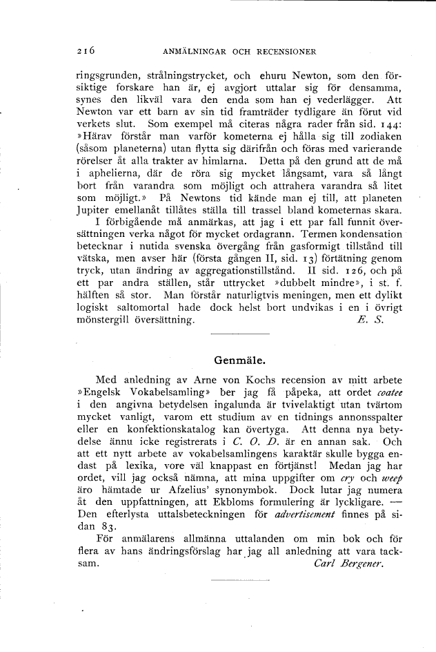 Full resolution (TIFF) - On this page / på denna sida - Häfte 6 - Anmälningar och recensioner - Emil Solander. Isaac Newton. Naturvetenskapens matematiska principer. I och II - Carl Bergener. Genmäle