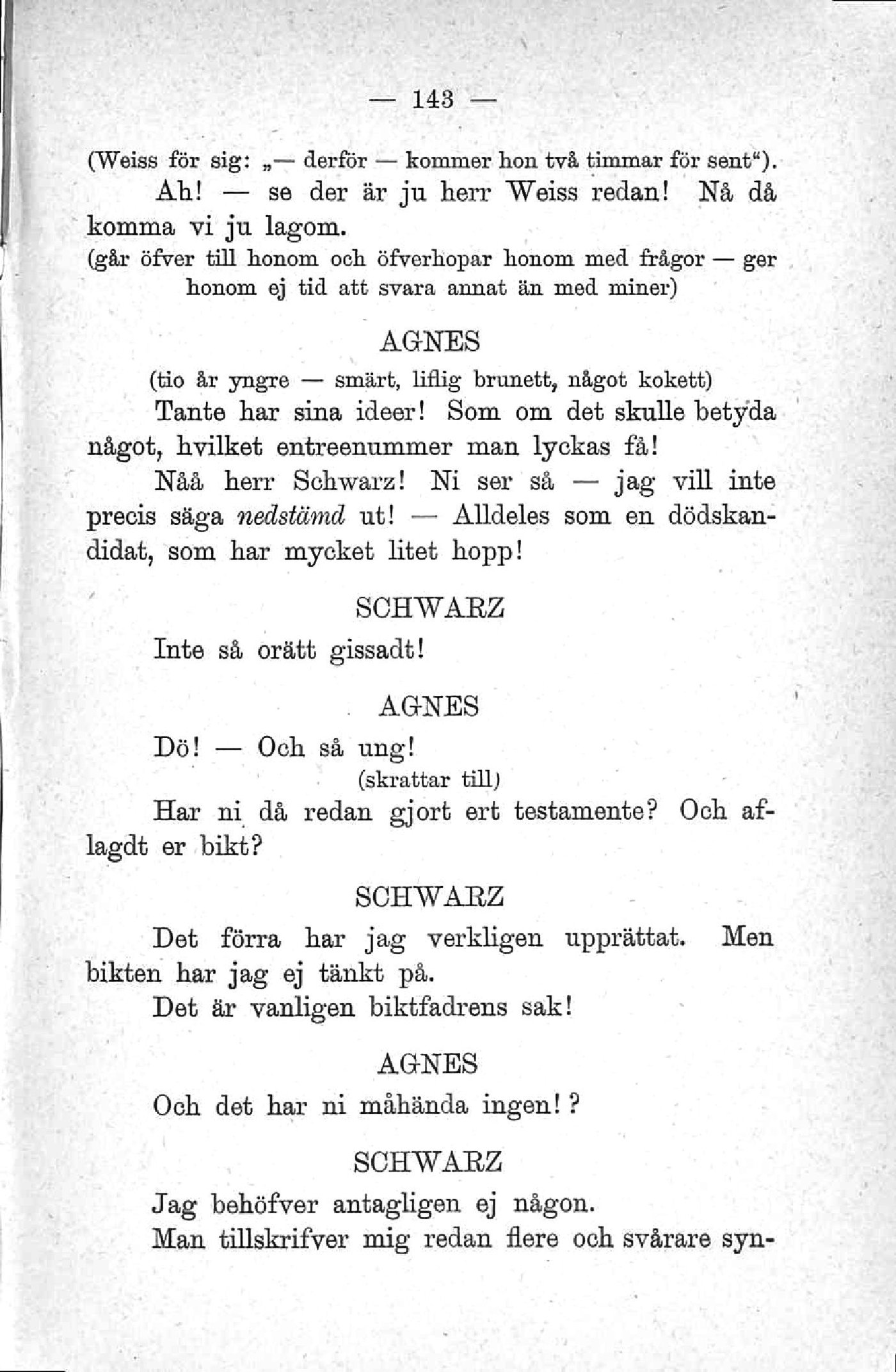 (Weiss för sig: „— derför — kommer hon två timmar för sent“).