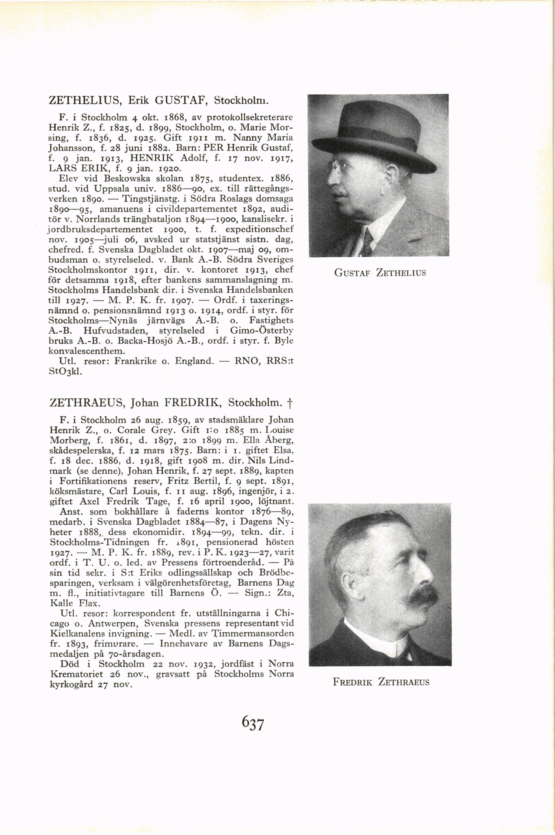 ZETHELIUS, Erik GUSTAF, Stockholm.