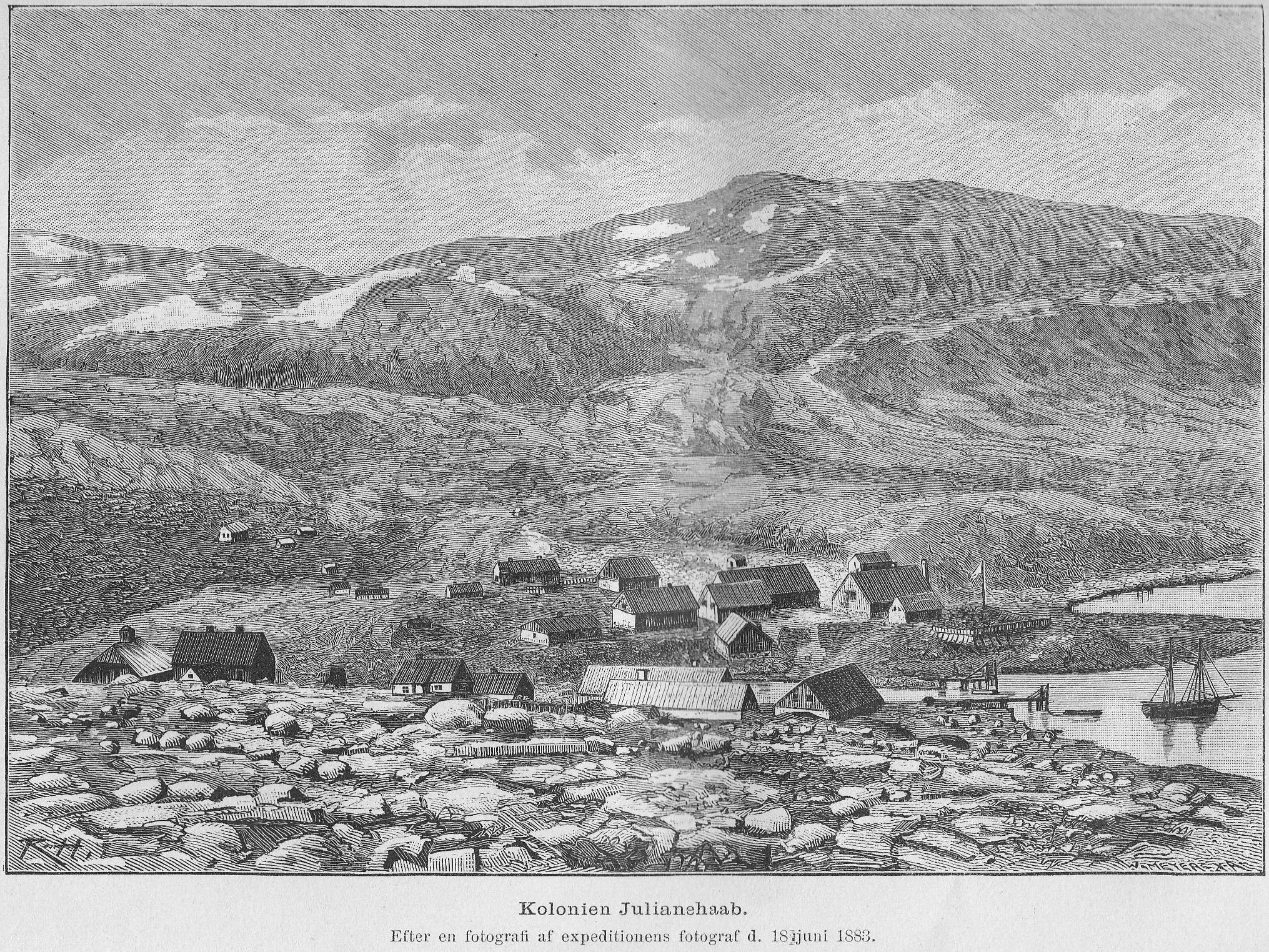 Ill. R. H.[=Haglund] W. MEYER, X. A. Kolonien Julianehaab. Efter en fotografi af expeditionens fotograf d. 18 juni 1883. |