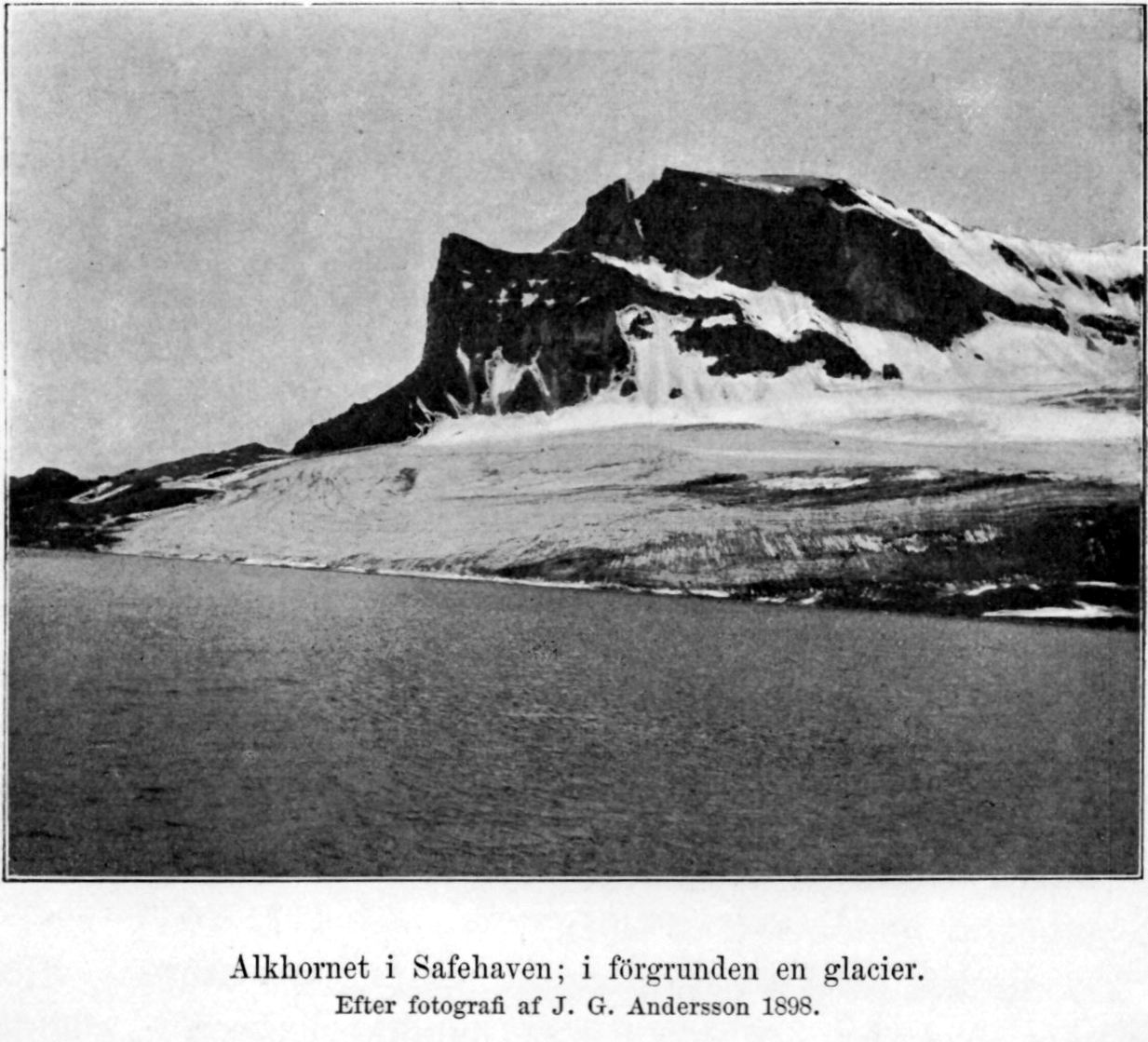 | Alkhornet i Safehaven; i förgrunden en glacier. Efter fotografi af J. G. Andersson 1898. |