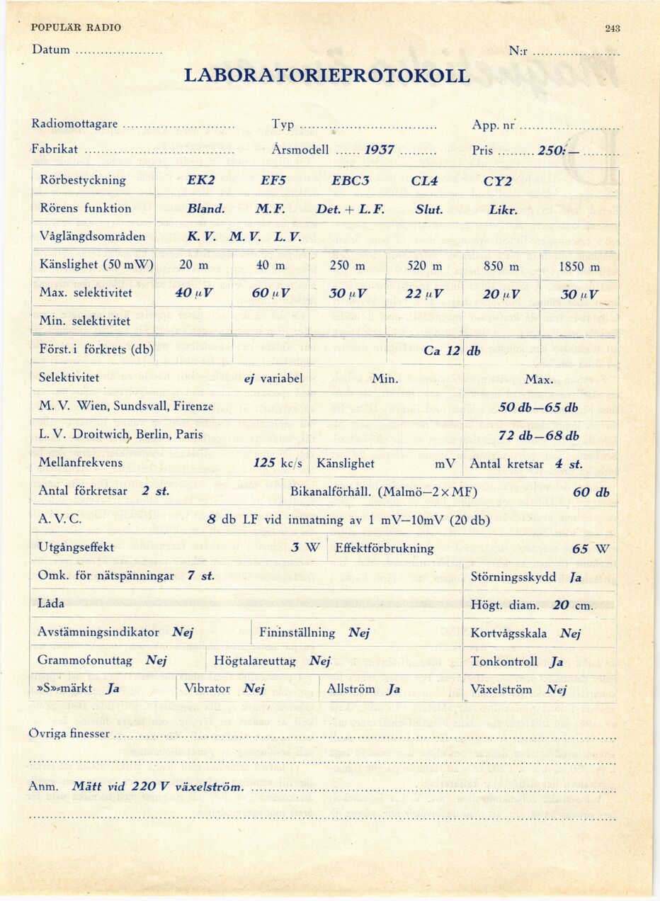 Fabrikat .................................... Årsmodell ...... 1937 ......... Pris .........250: —