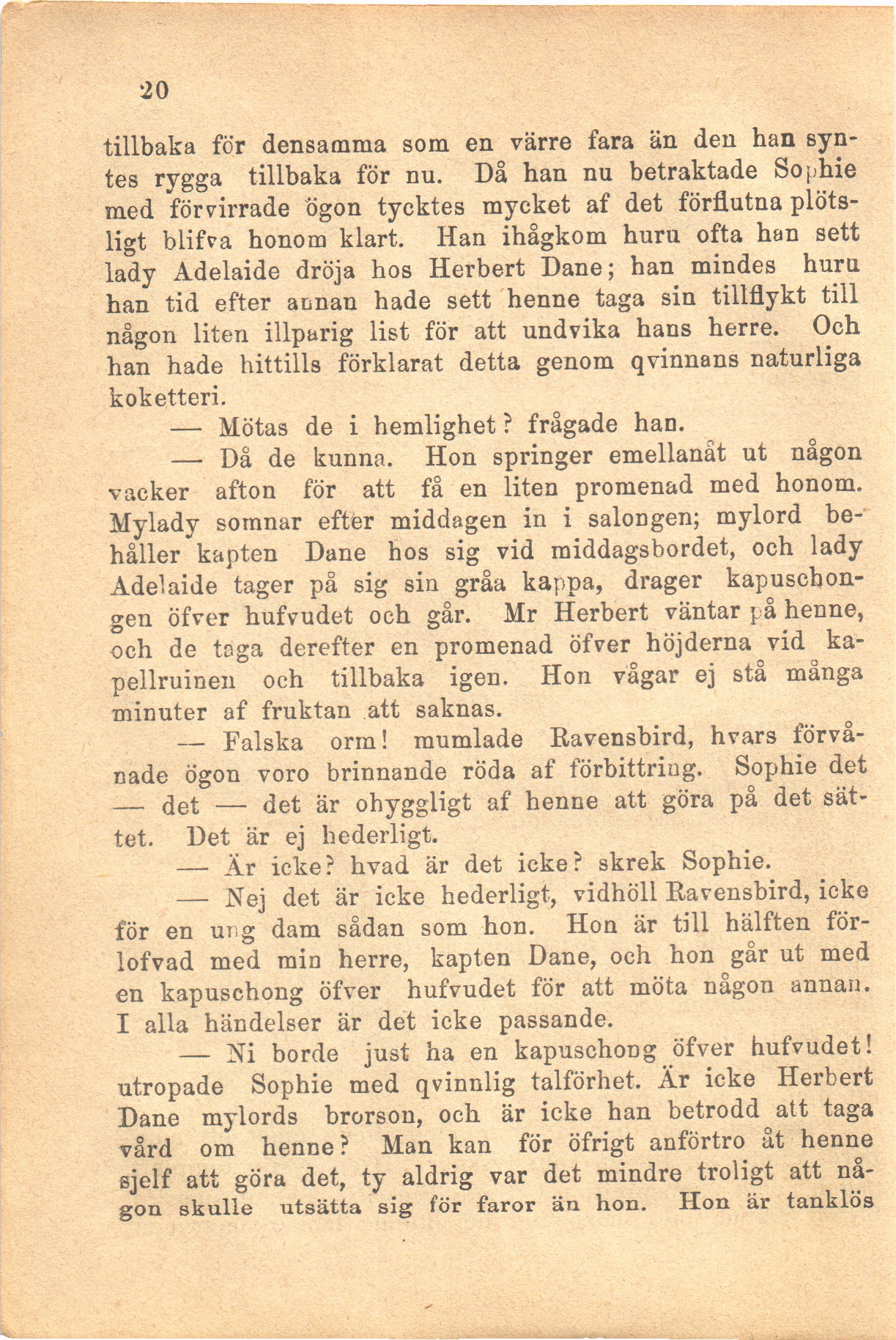 — Nej det är icke hederligt, vidhöll Eavensbird, icke