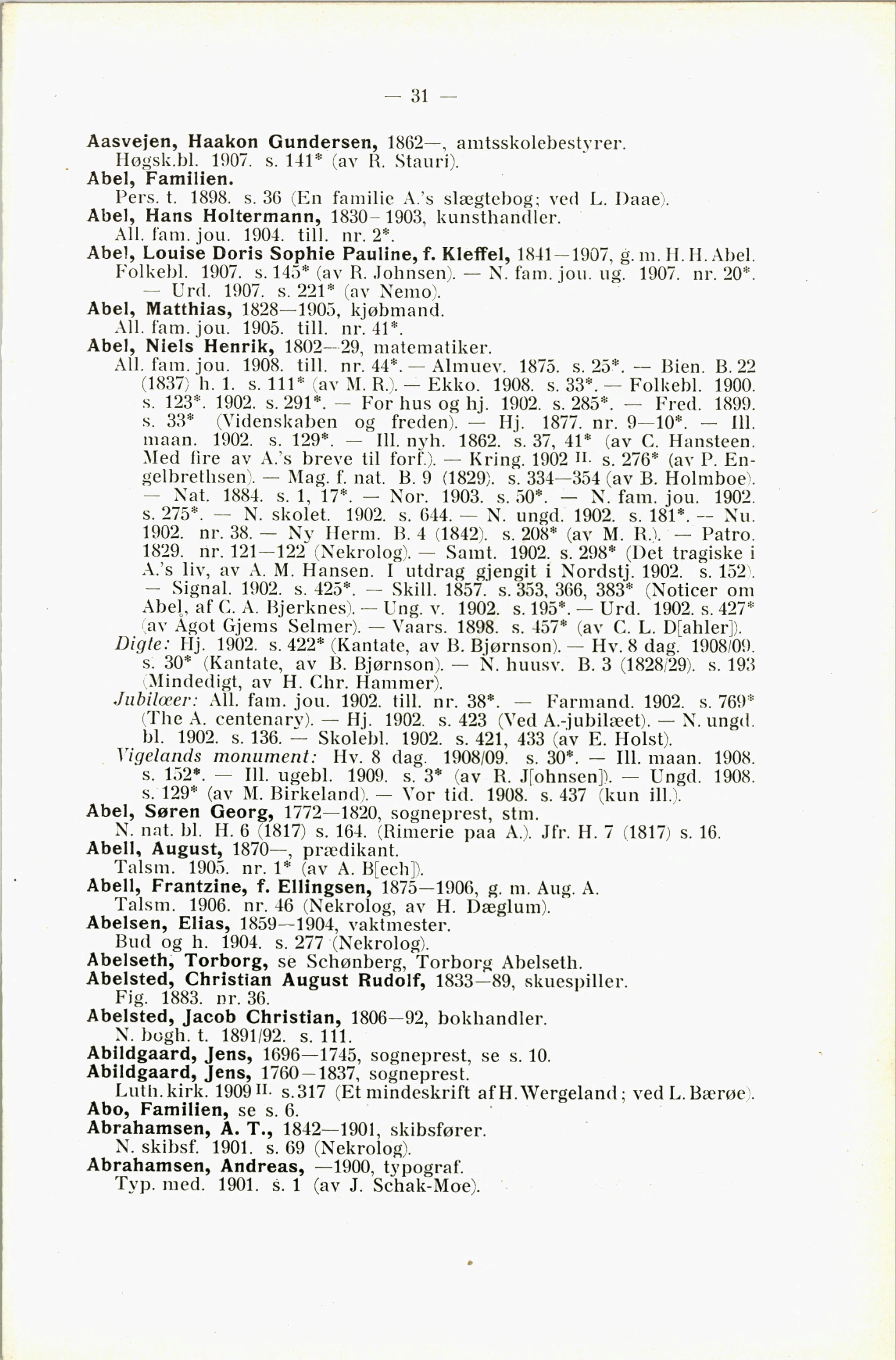 Abel, af C. A. Bjerknes^. — Ung. v. 1902. s. 195*. — Urd. 1902. s. 427*