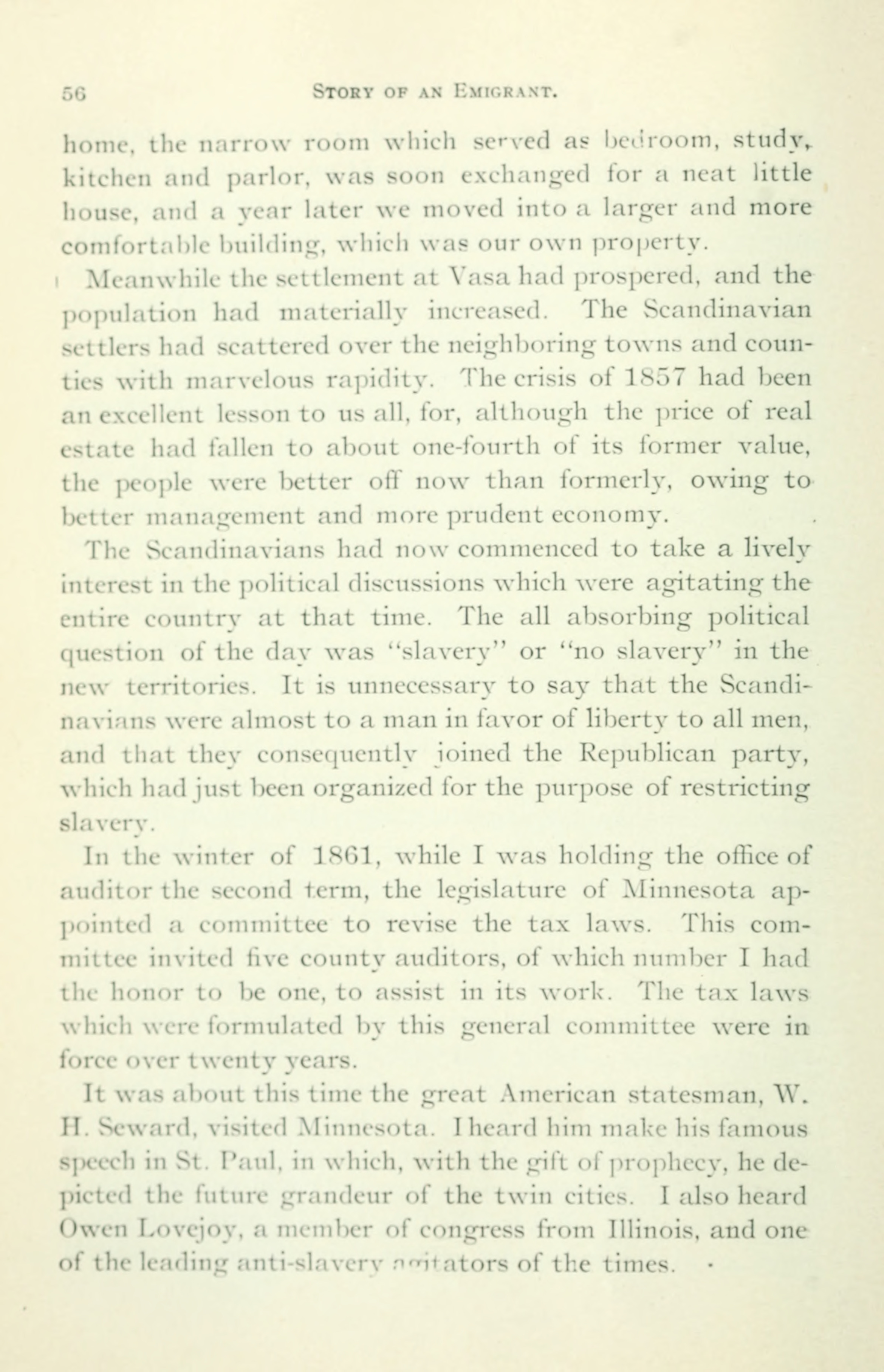 Full resolution (JPEG) - On this page / på denna sida - IV. Future Hopes—Farm Life—Norwegian Pioneers—The Condition of the Immigrant at the Beginning of the Fifties—Religious Meetings—The Growth of the Settlement—Vasa Township Organized—A Lutheran Church Established—My Wedding—Speculation—The Crisis of 1857—Study of Law in Red Wing—I am admitted to the Bar and elected County Auditor—Politics in 1860—War is Imminent