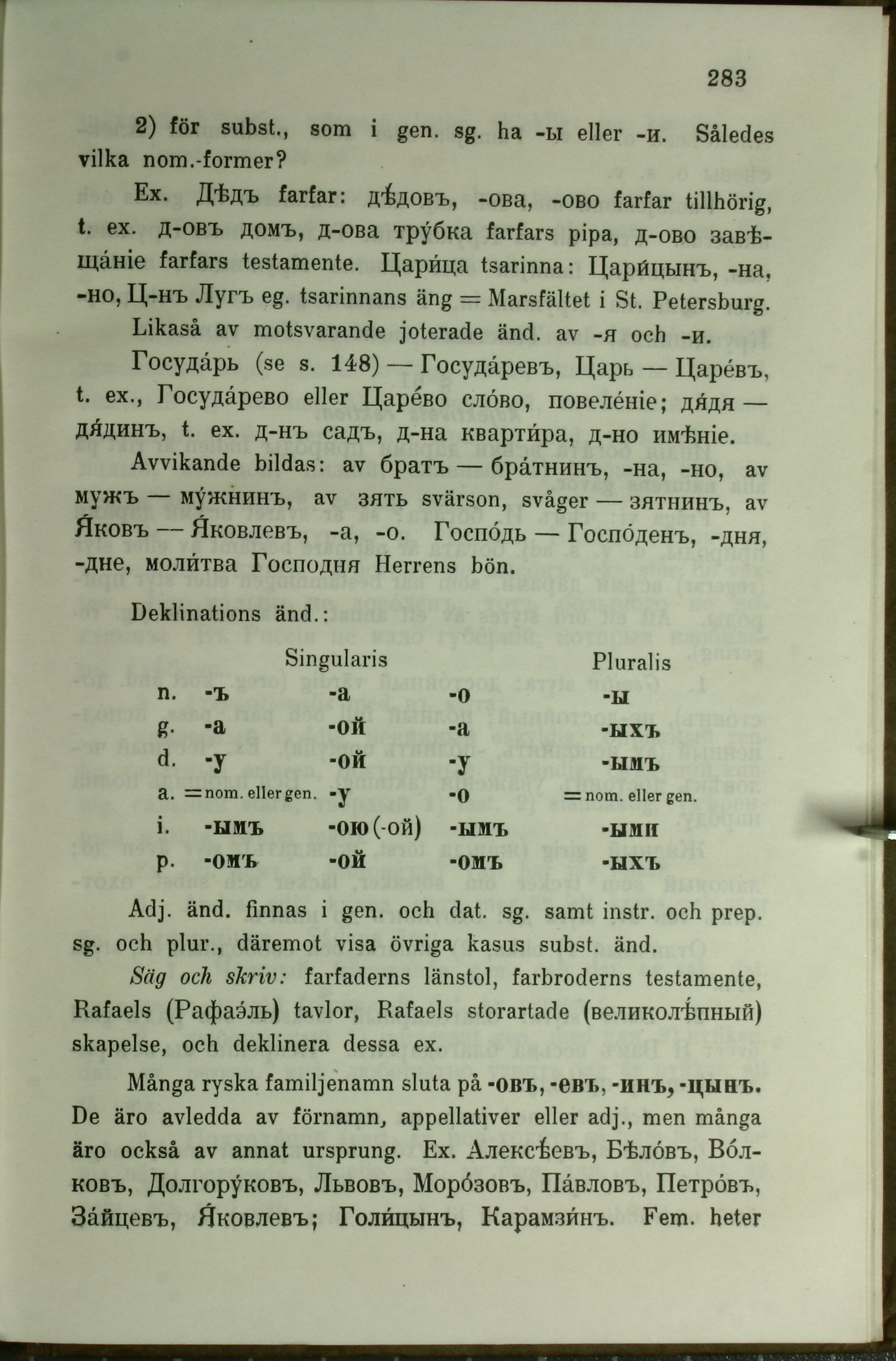 Ex. Дѣдъ farfar: дѣдовъ, -ова, -ово farfar tillhörig,