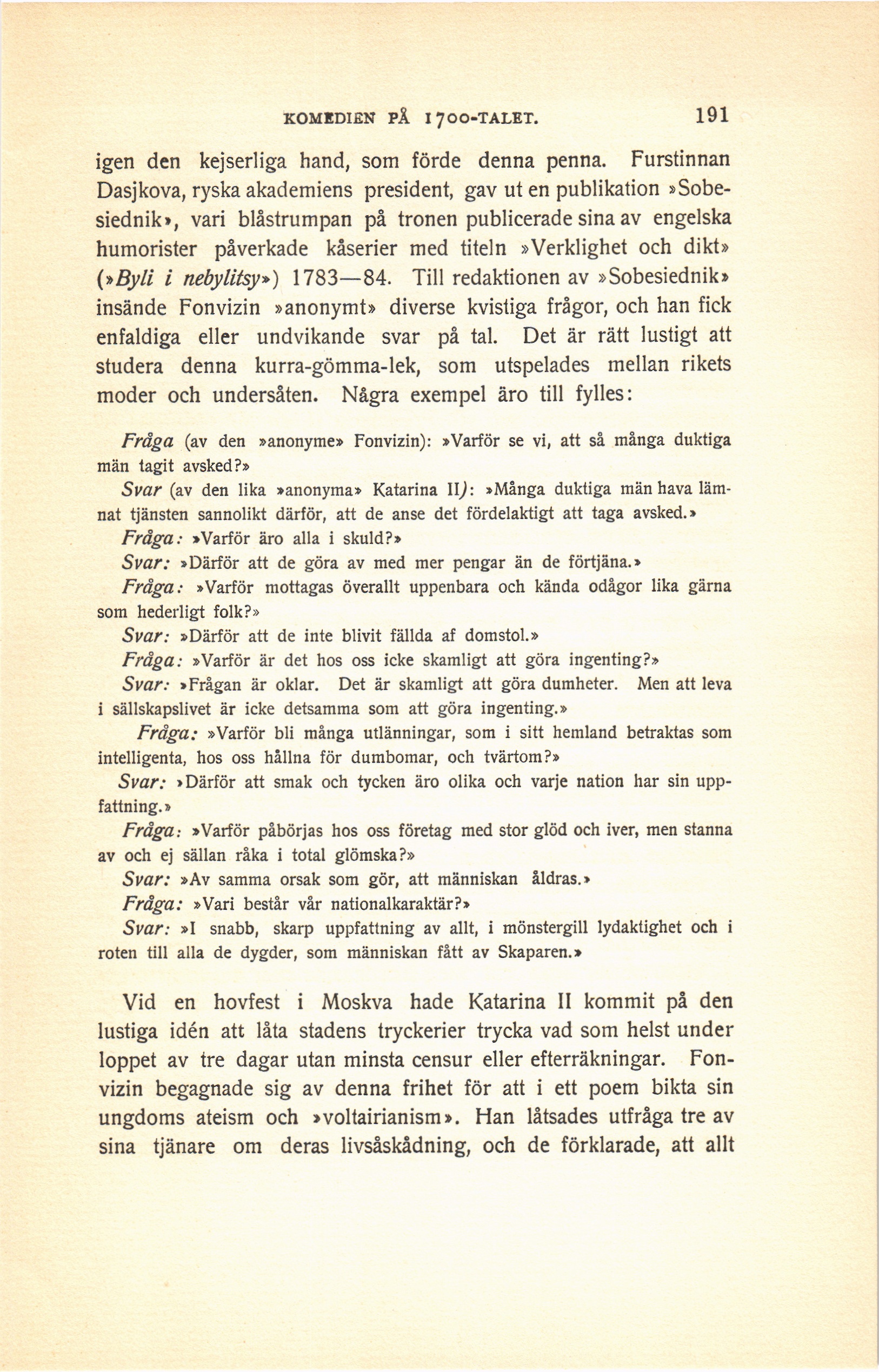 Fråga (av den »anonyme» Fonvizin): »Varför se vi, att så många duktiga