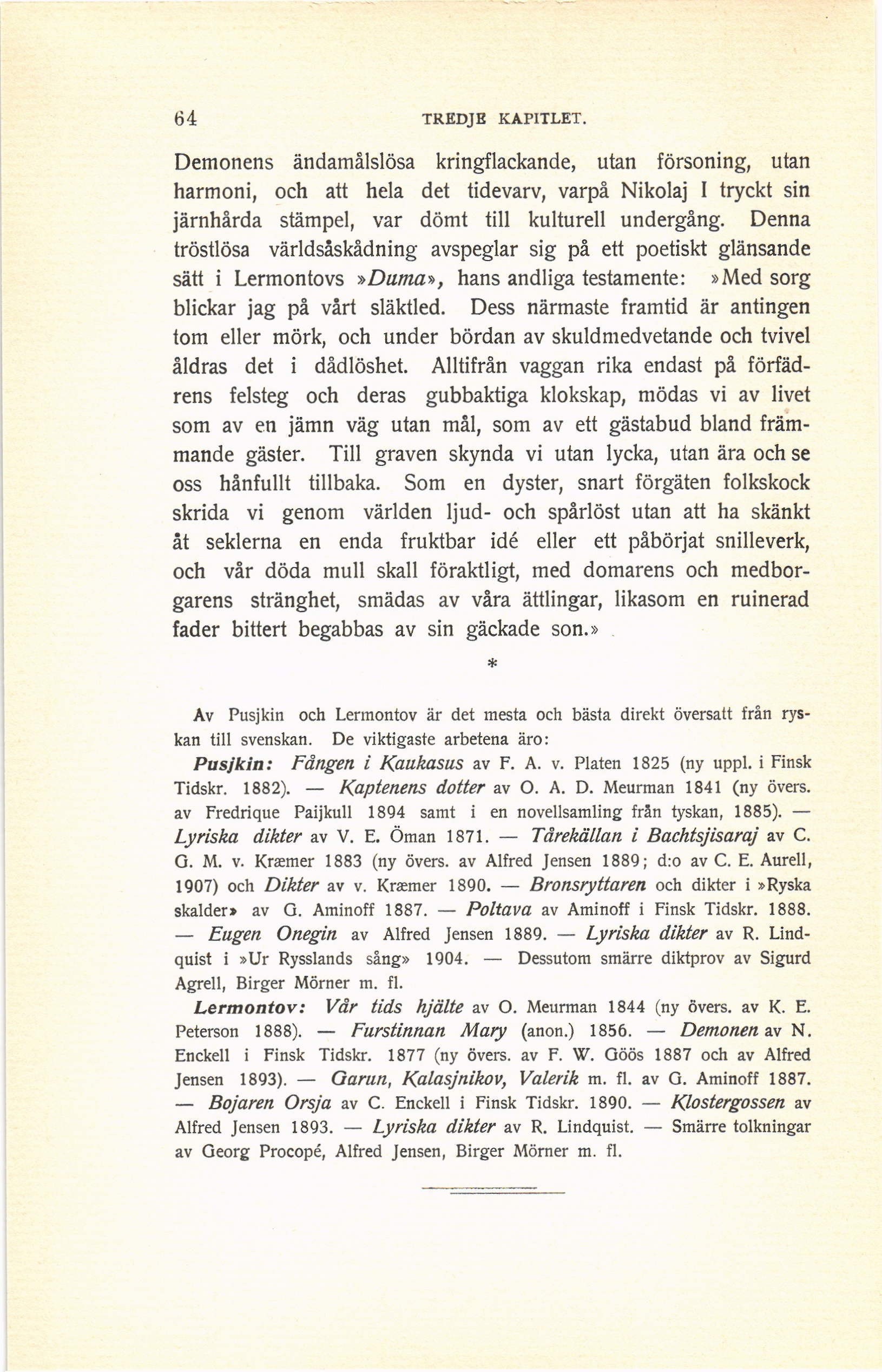 sätt i Lermontovs »Duma», hans andliga testamente: »Med sorg