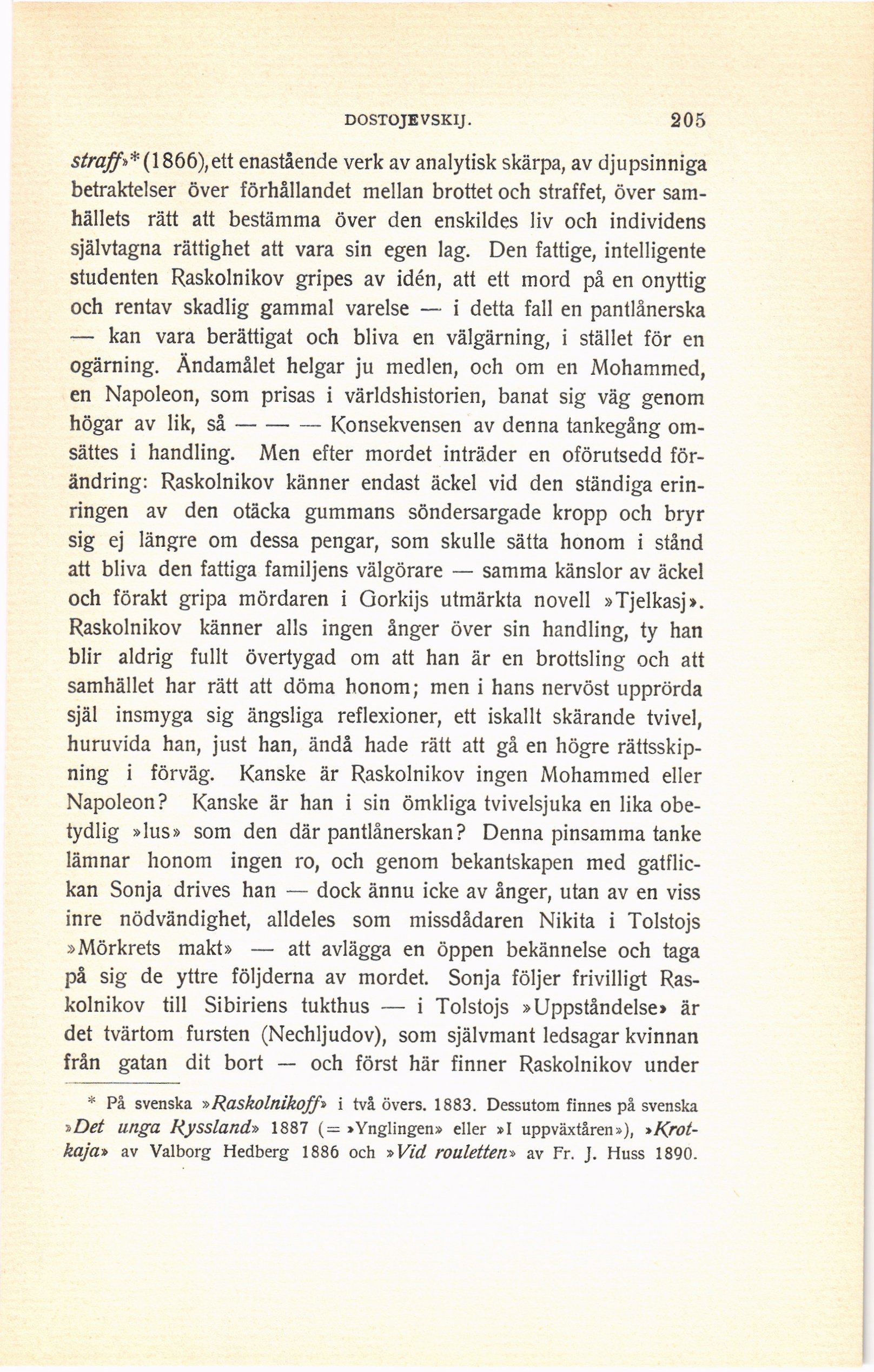 * På svenska »Raskolnikoff» i två övers. 1883. Dessutom finnes på svenska