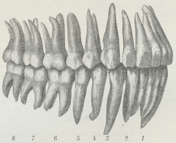 Fig. 3. Højre Tandrækker i Lukkestill ng (naturlig Størrelse). 1—2 Fortænder, 3 Hjørnetand, 4—5 Præmolarer (= smaa Kindtænder), 6—7 Molarer (= store Kindtænder), 8 Visdomstand. |