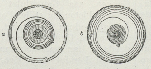 Fig. 2. Urfjeder, a i optrukken Tilstand, b i udløben Tilstand. |
