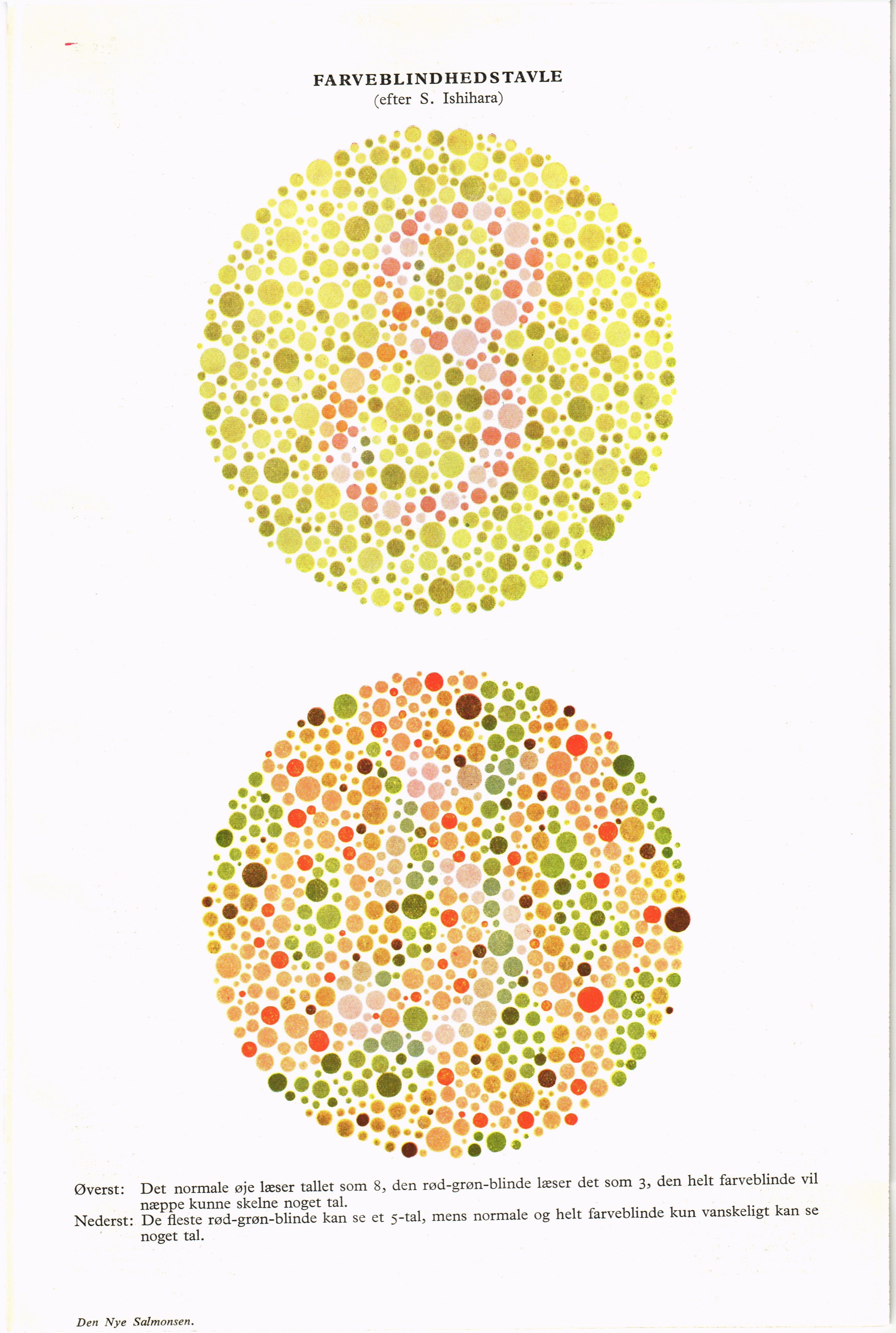 Øverst: Det normale øje læser tallet som 8, den rød-grøn-blinde læser det som 3, den helt farveblinde vil