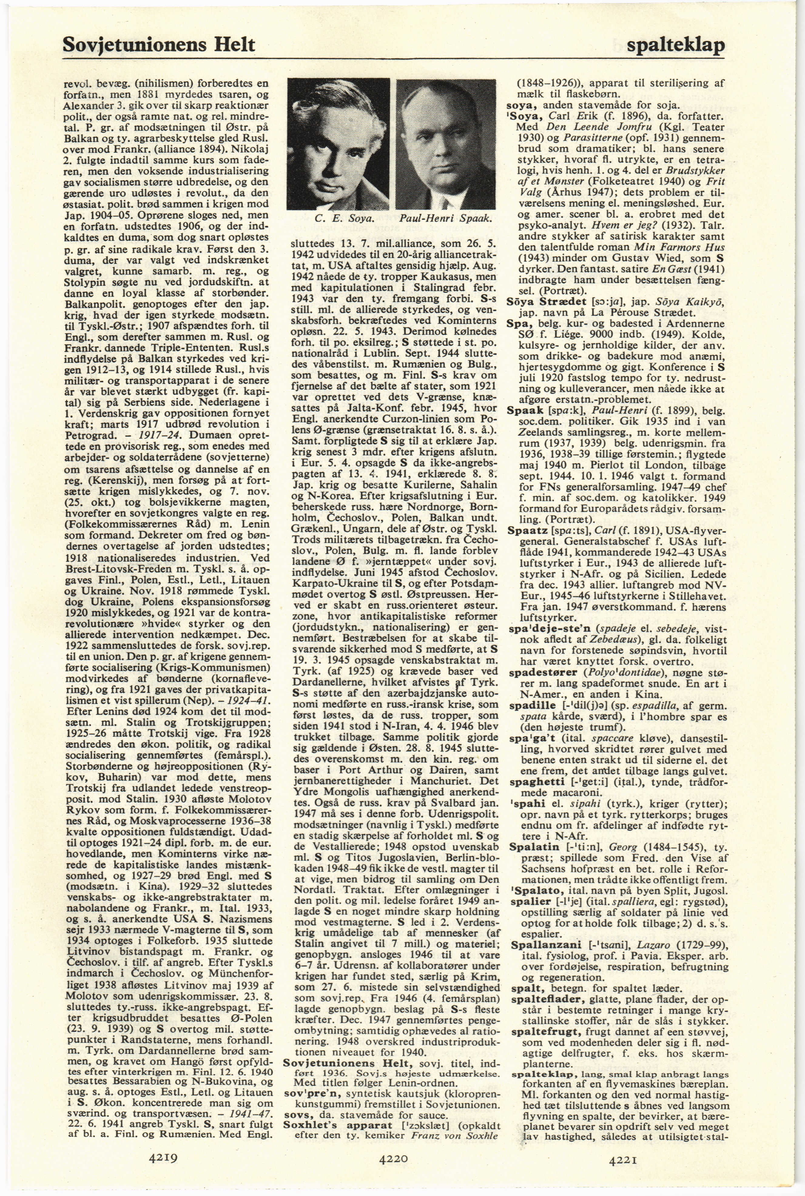 Full resolution (JPEG) - On this page / på denna sida - Sovjetunionen - Sovjetunionens Helt - sovpren - sovs - Soxhlet's apparat - soya - Soya, Carl Erik - Soya Strædet - Spa - Spaak, Paul-Henri - Spaatz, Carl - spadeje-sten - spadestører - spadille - spagat - spaghetti - spahi - Spalatin, Georg - Spalato - spalier - Spallanzani, Lazaro - spalt - spalteflader - spaltefrugt - spalteklap