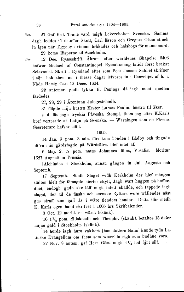 K. Karls egen hand skrifvet i 1605 års Skrifcalender.