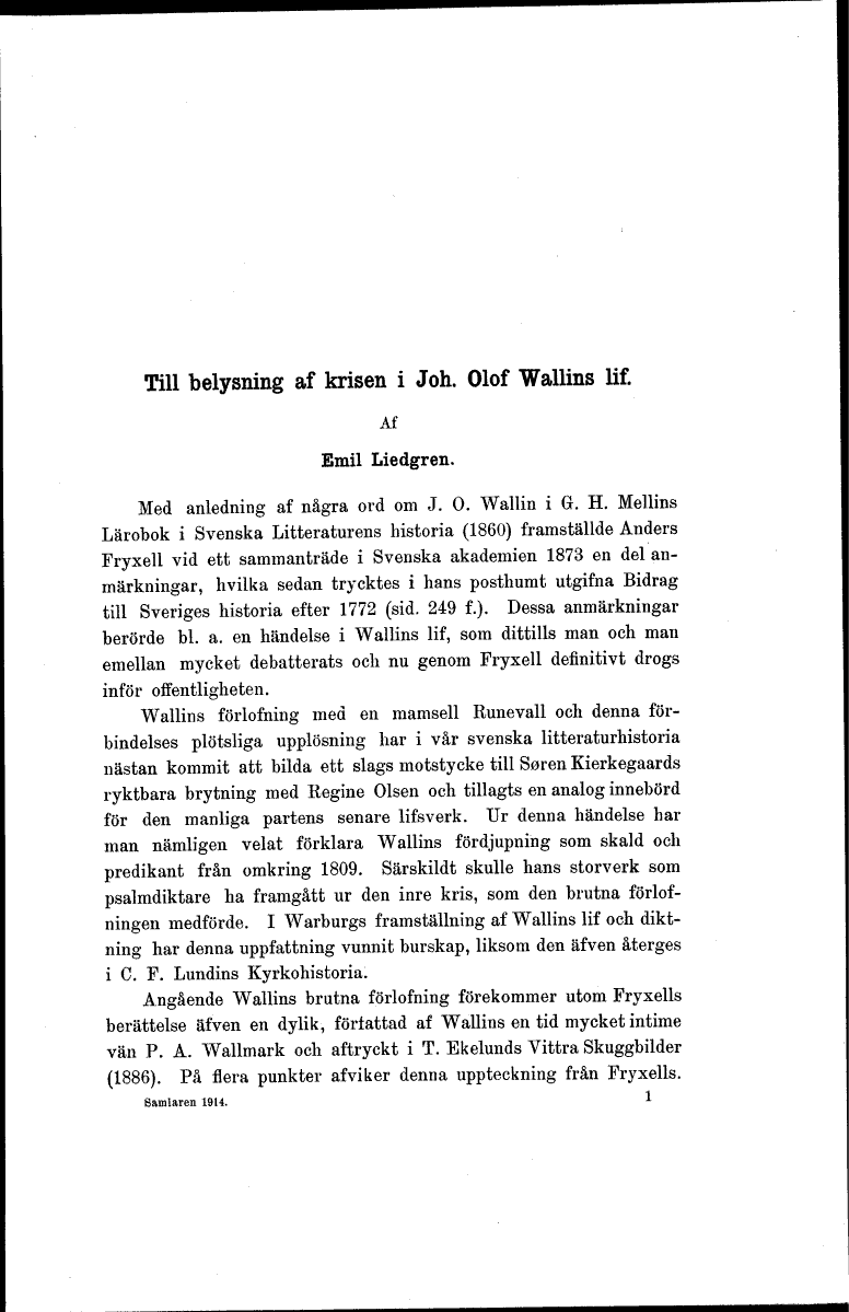 - Emil Liedgren, Till belysning af krisen i Joh. Olof Wallins lif