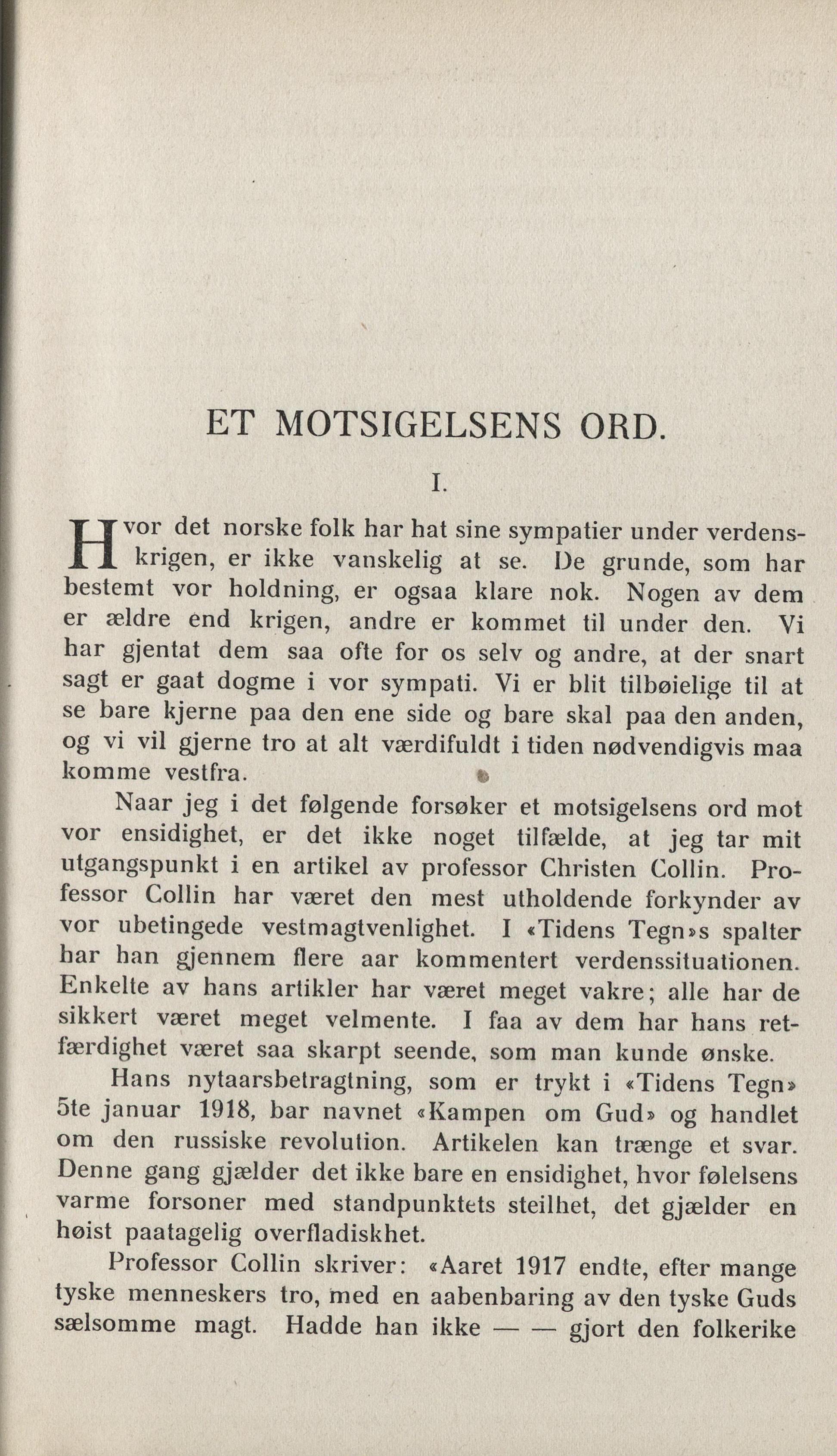 Naar jeg i det følgende forsøker et motsigelsens ord mot