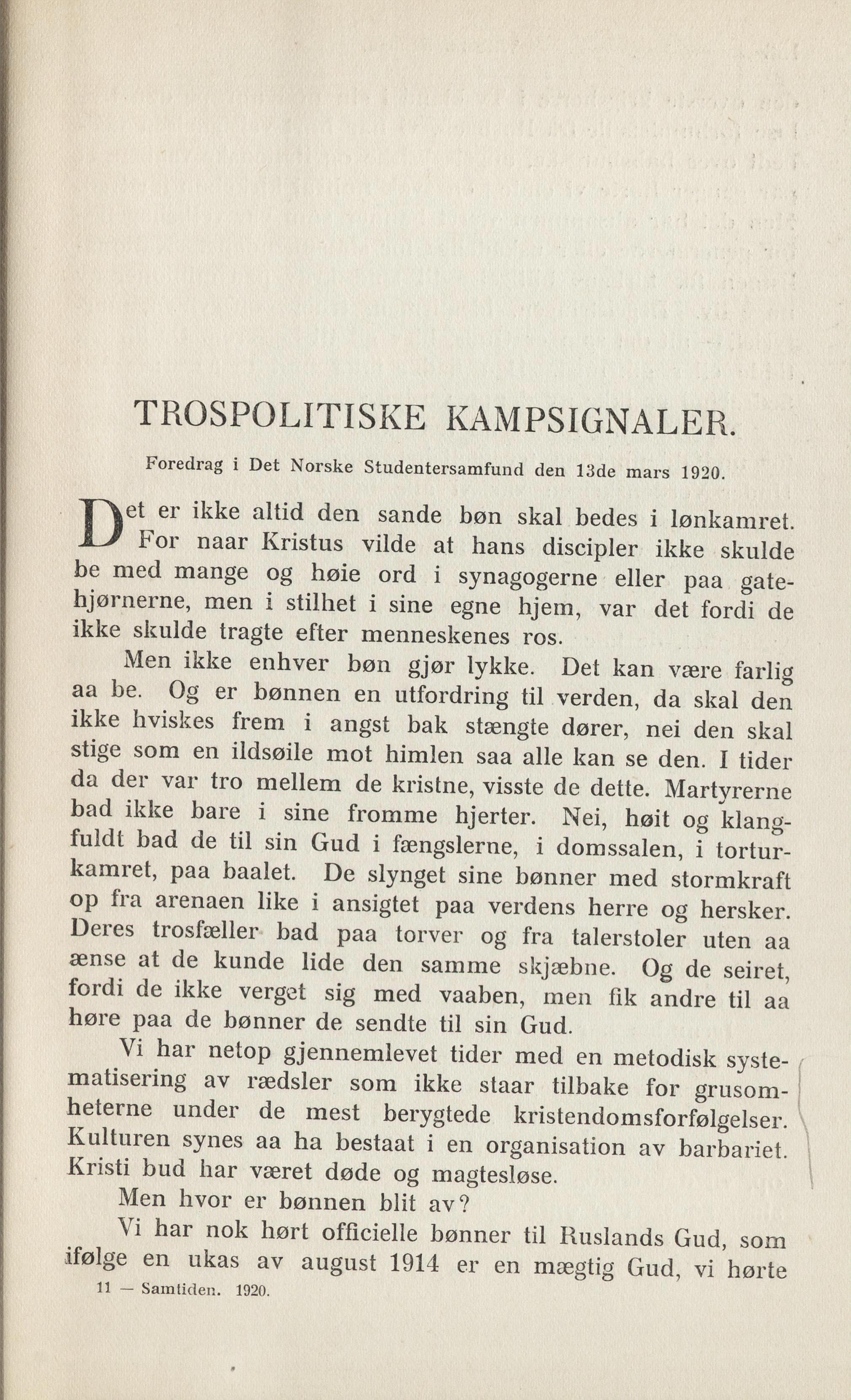 Foredrag i Det Norske Studentersamfund den 13de mars 1920.