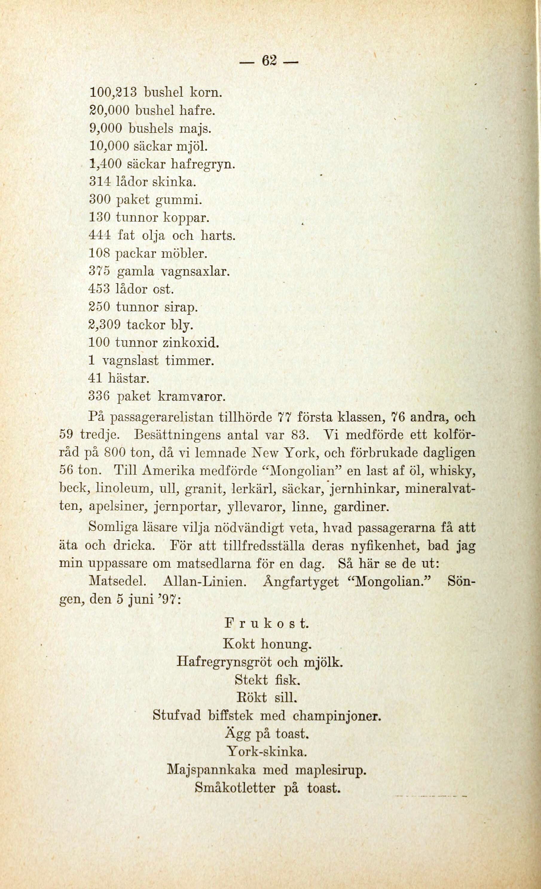 96 ton. Till Amerika medförde "Mongolian” en last af öl, whisky,