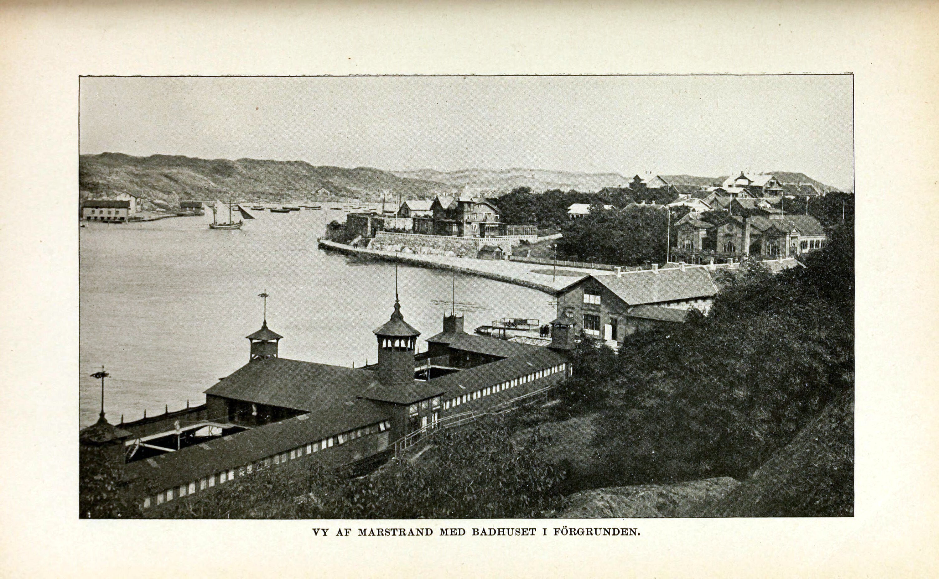 VY AF MARSTRAND MED BADHUSET I FÖRGRUNDEN.