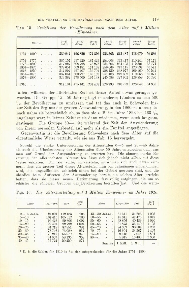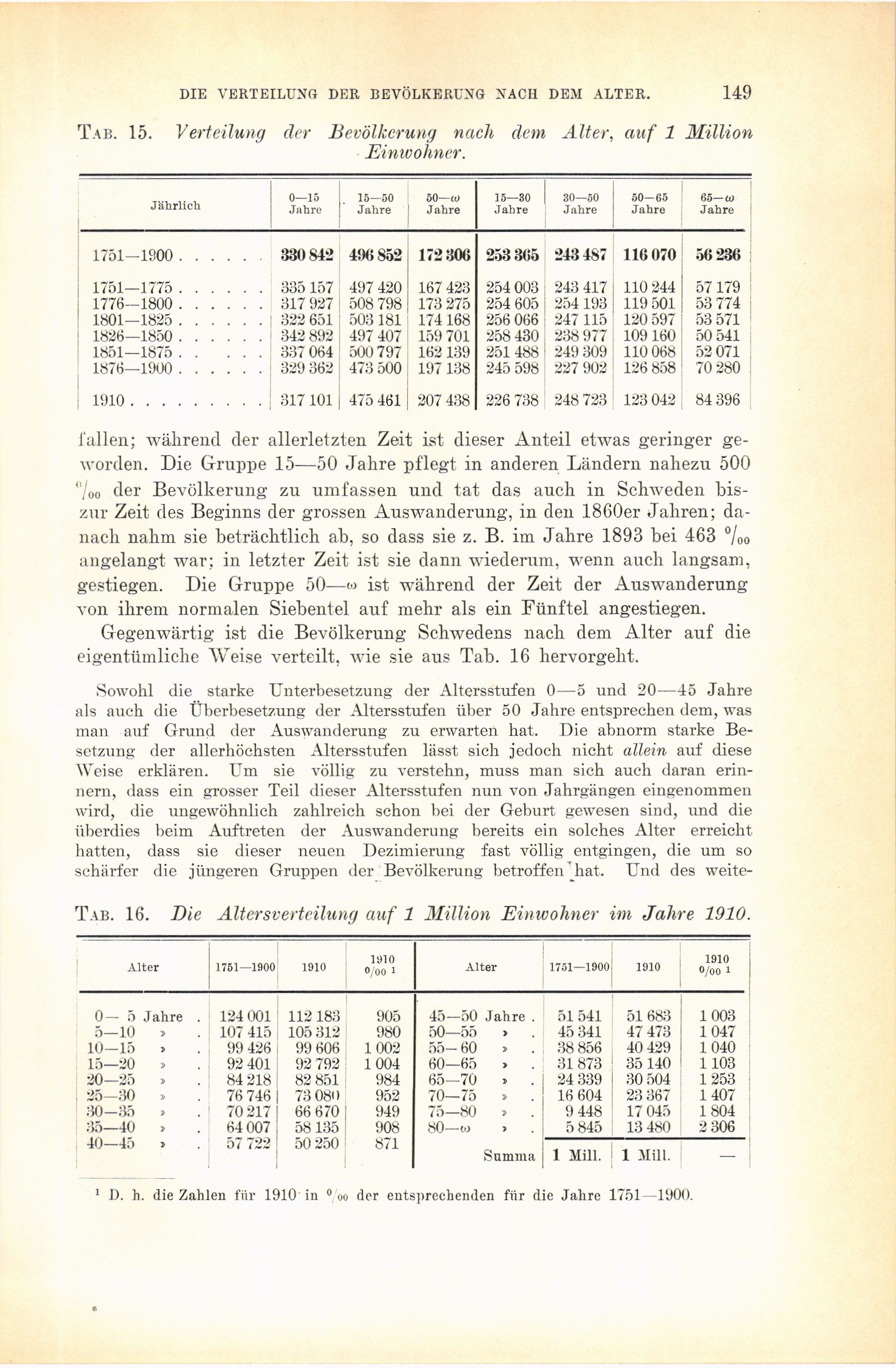 Tab. 15. Verteilung der Bevölkerung nach dem Alter, auf 1 Million