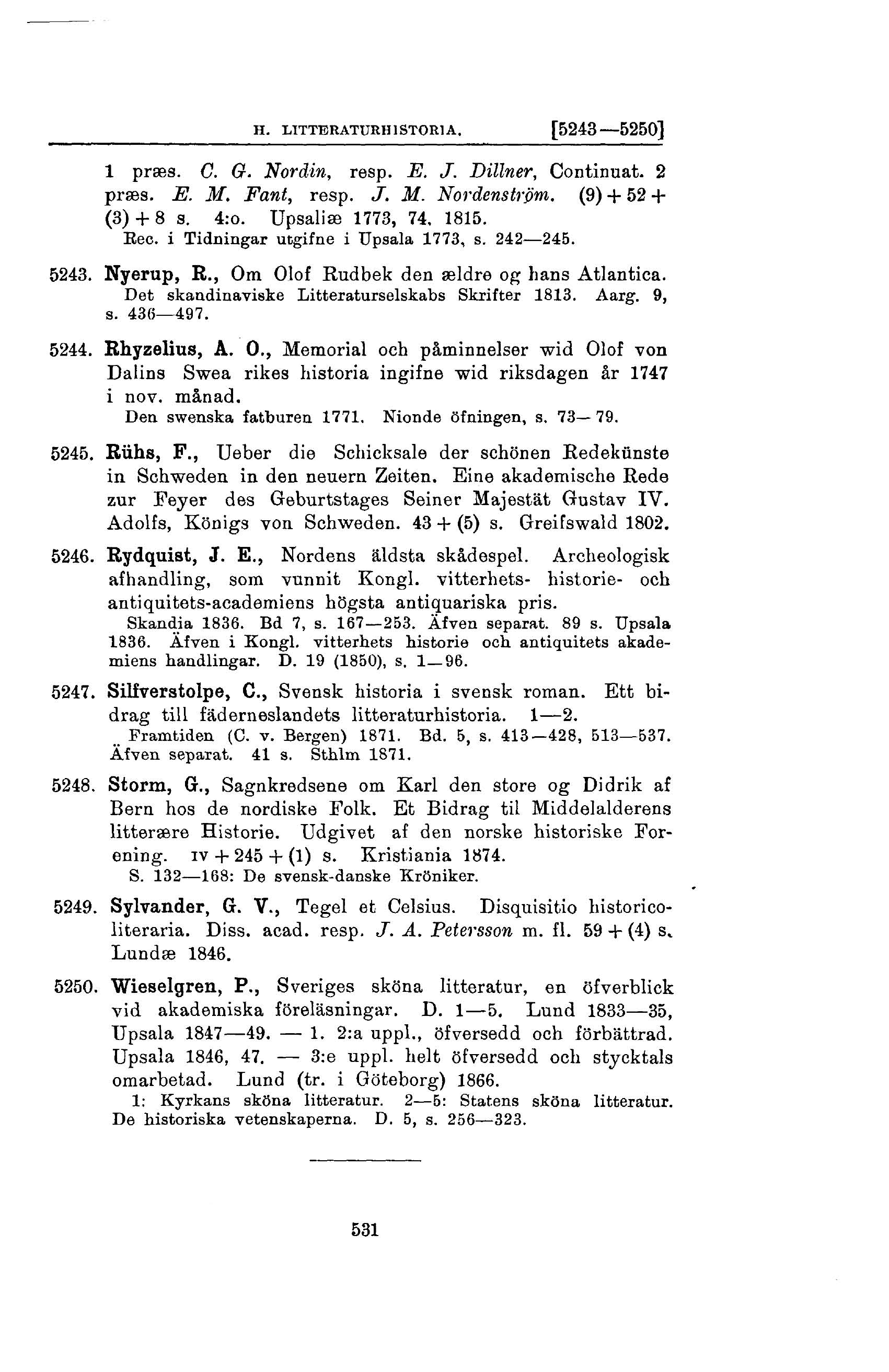 5250. Wieselgren, P., Sveriges sköna litteratur, en öfverblick