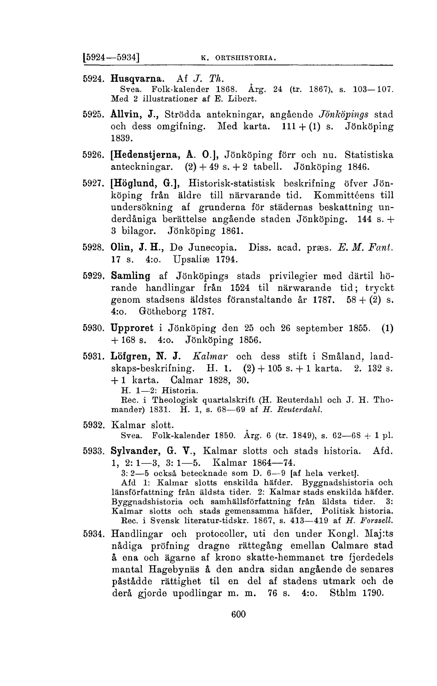 5925. Allvin, J., Strödda antekningar, angående Jönköpings stad