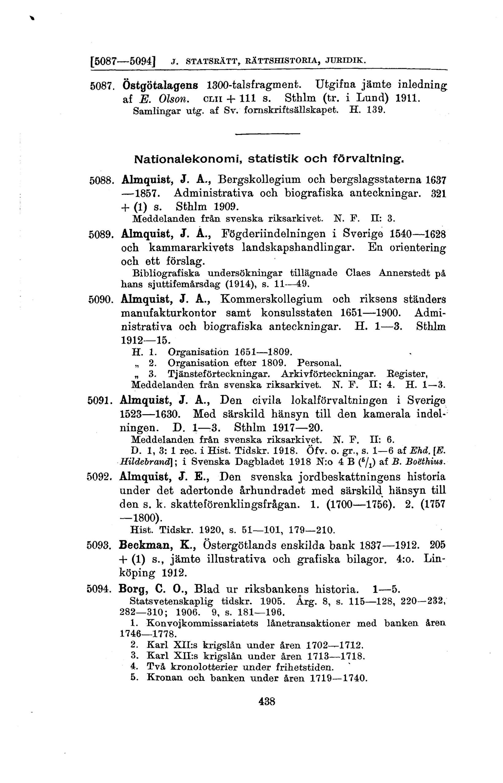 5092. Almquist, J". E., Den svenska jordbeskattningens historia