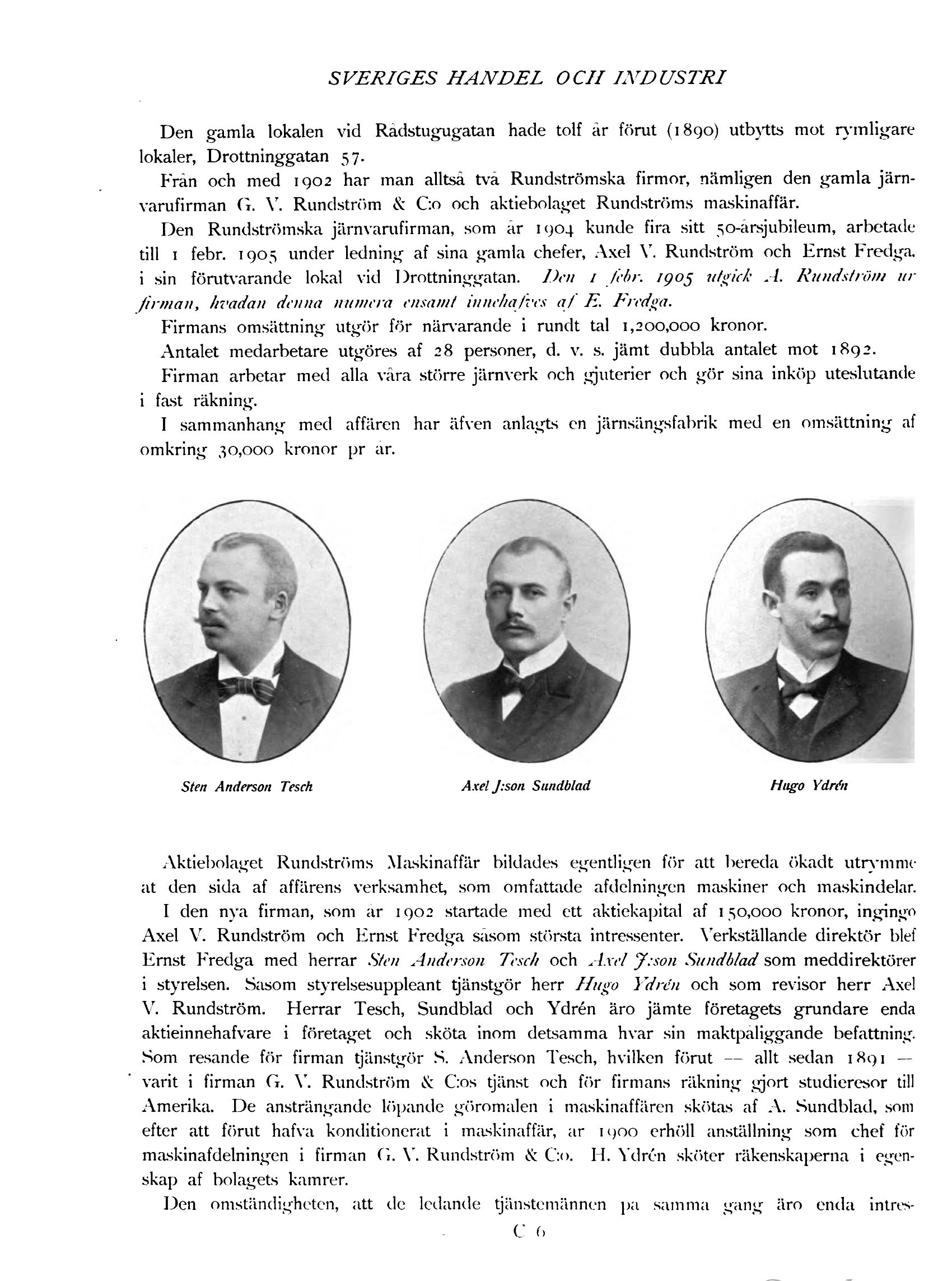 V. Rundström. Herrar Tesch, Sundblad och Ydrén äro jämte företagets grundare enda
