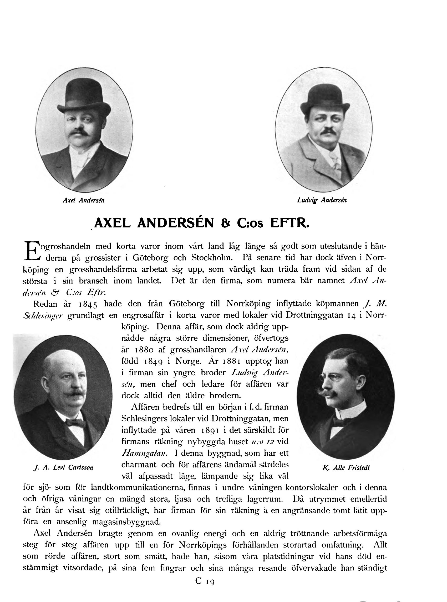 Axel Andersén bragte genom en ovanlig energi och en aldrig tröttnande arbetsförmåga steg för steg affären upp till en för Norrköpings förhållanden storartad omfattning. Allt som rörde affären, stort som smått, hade han, såsom våra platstidningar vid hans död enstämmigt vitsordade, på sina fem fingrar och sina många resande öfvervakade han ständigt