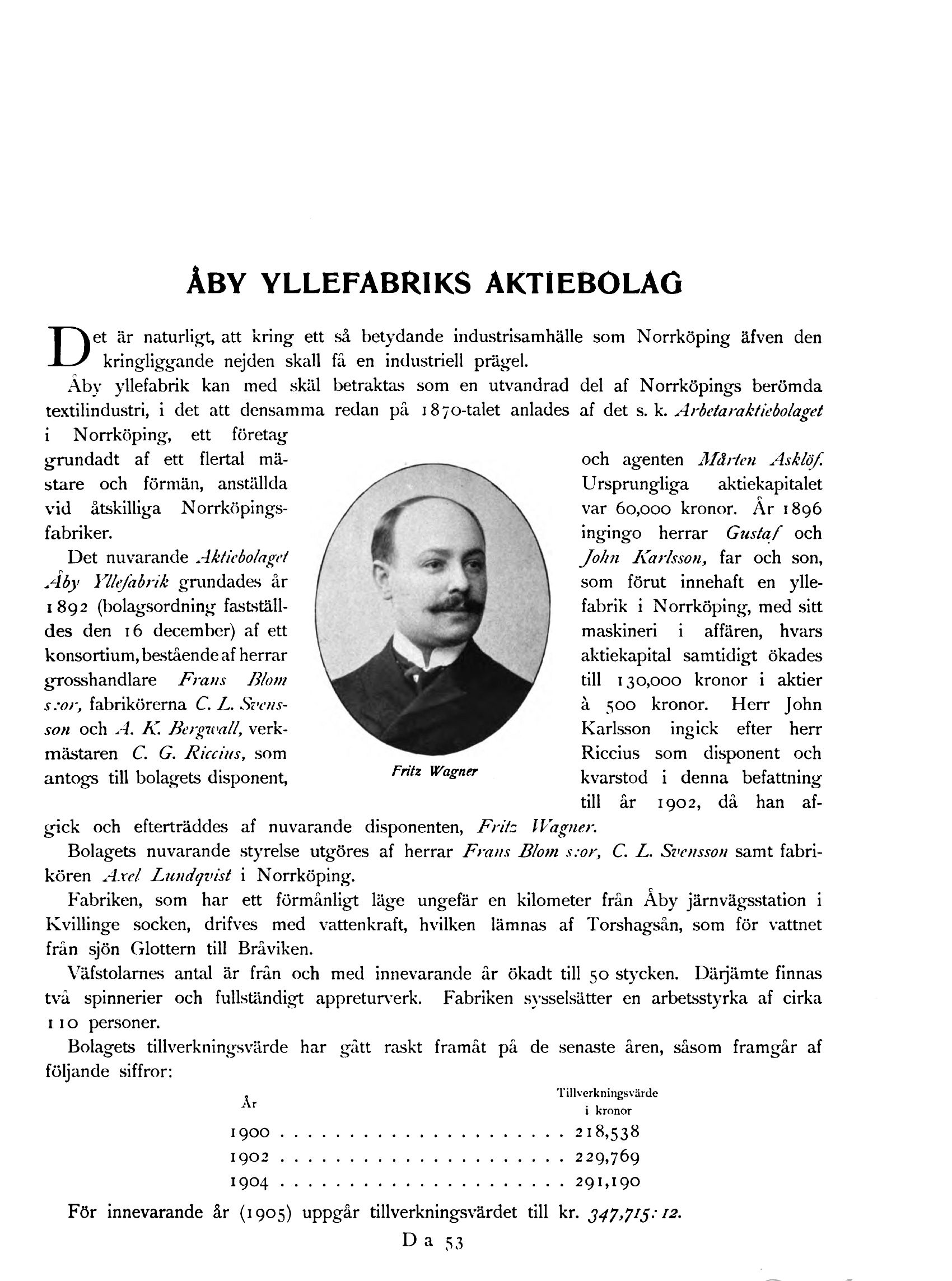 För innevarande år (1905) uppgår tillverkningsvärdet till kr. 347,715:12.