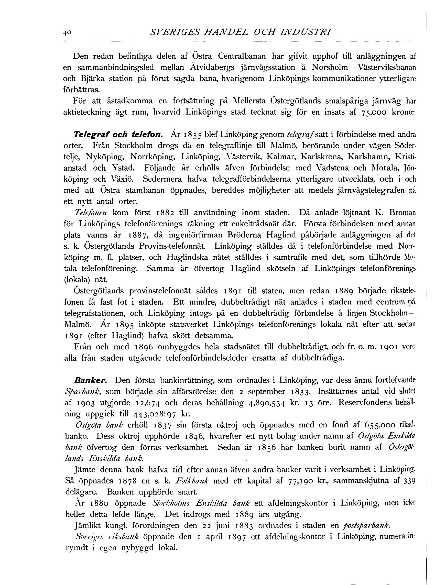 Banker. Den första bankinrättning, som ordnades i Linköping, var dess ännu fortlefvande
