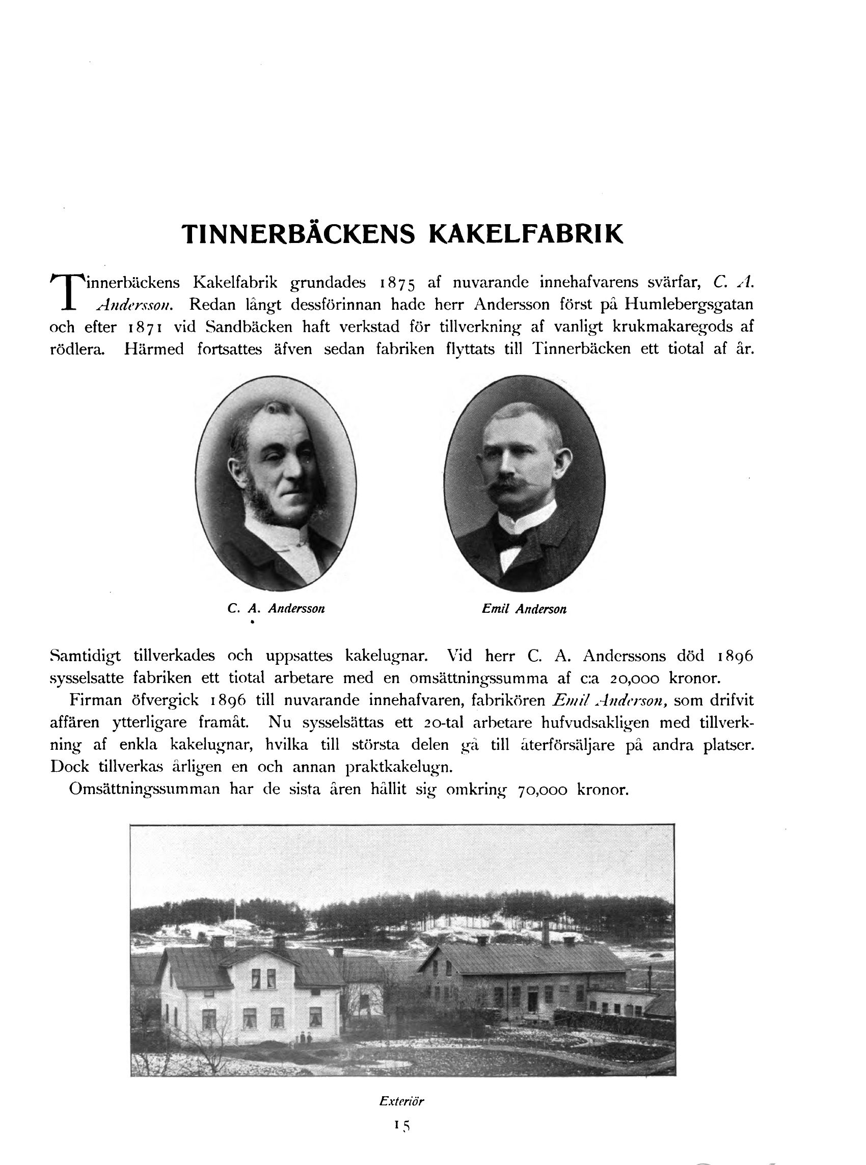Tinnerbäckens Kakelfabrik grundades 1875 af nuvarande innehafvarens svärfar, C.