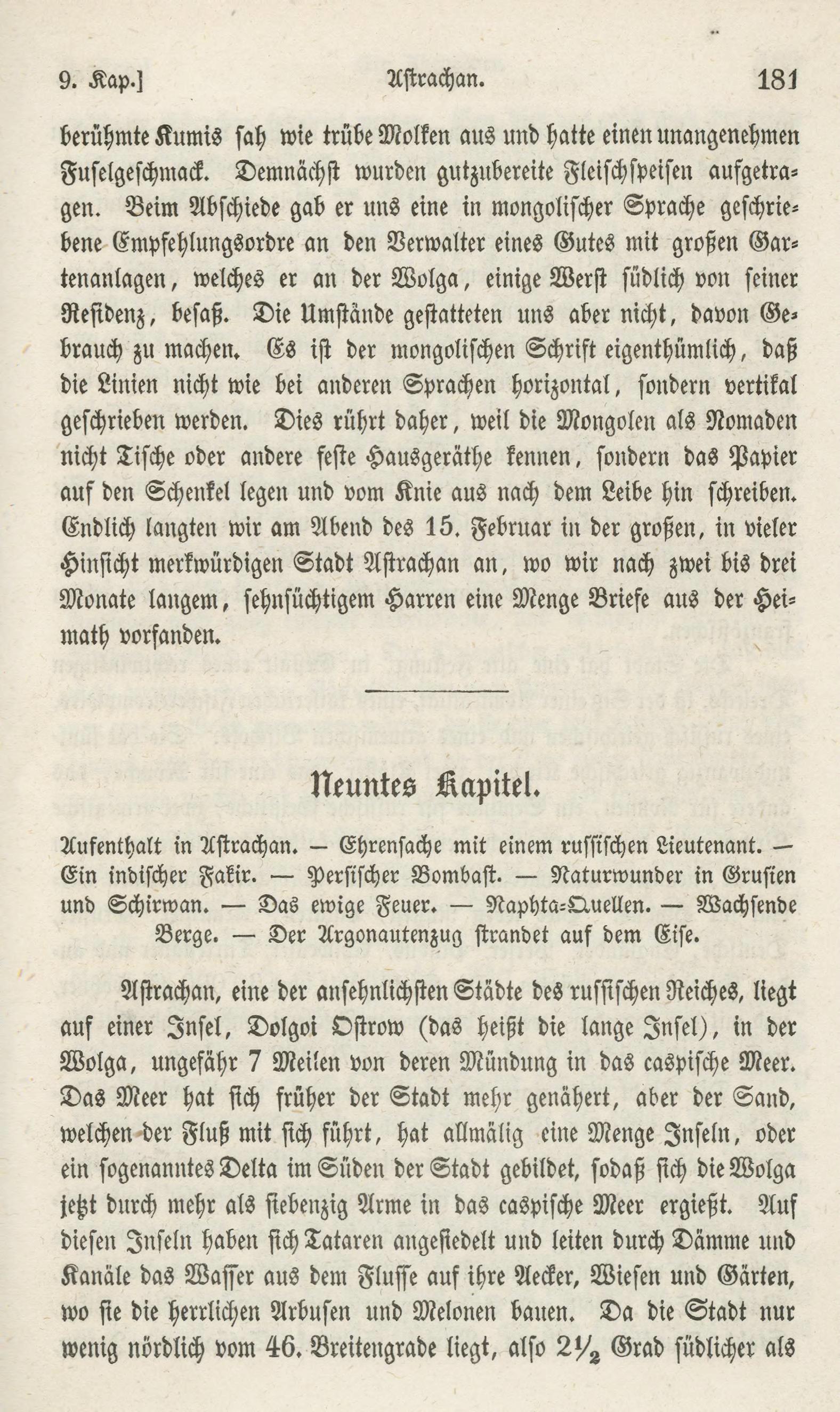 Full resolution (JPEG) - On this page / på denna sida - 8. Reise von Orenburg nach Astrachan. — Störfischerei der Kosaken auf dem Flusse Ural. — Reise über die Kirgisen-Steppe mit Kameelen. — Aufenthalt bei dem Kirgisen-Khan Dschanger in seinem Palaste mitten in der Steppe. — Besuch bei dem kalmuckischen Fursten Tiumén. — Ankunft in Astrachan - 9. Aufenthalt in Astrachan. — Ehrensache mit einem russischen Lieutenant. — Ein indischer Fakir. — Persischer Bombast. — Naturwunder in Grusien und Schirwan. — Das ewige Feuer. — Naphta-Quellen. — Wachsende Berge. — Der Argonautenzug strandet auf dem Eise