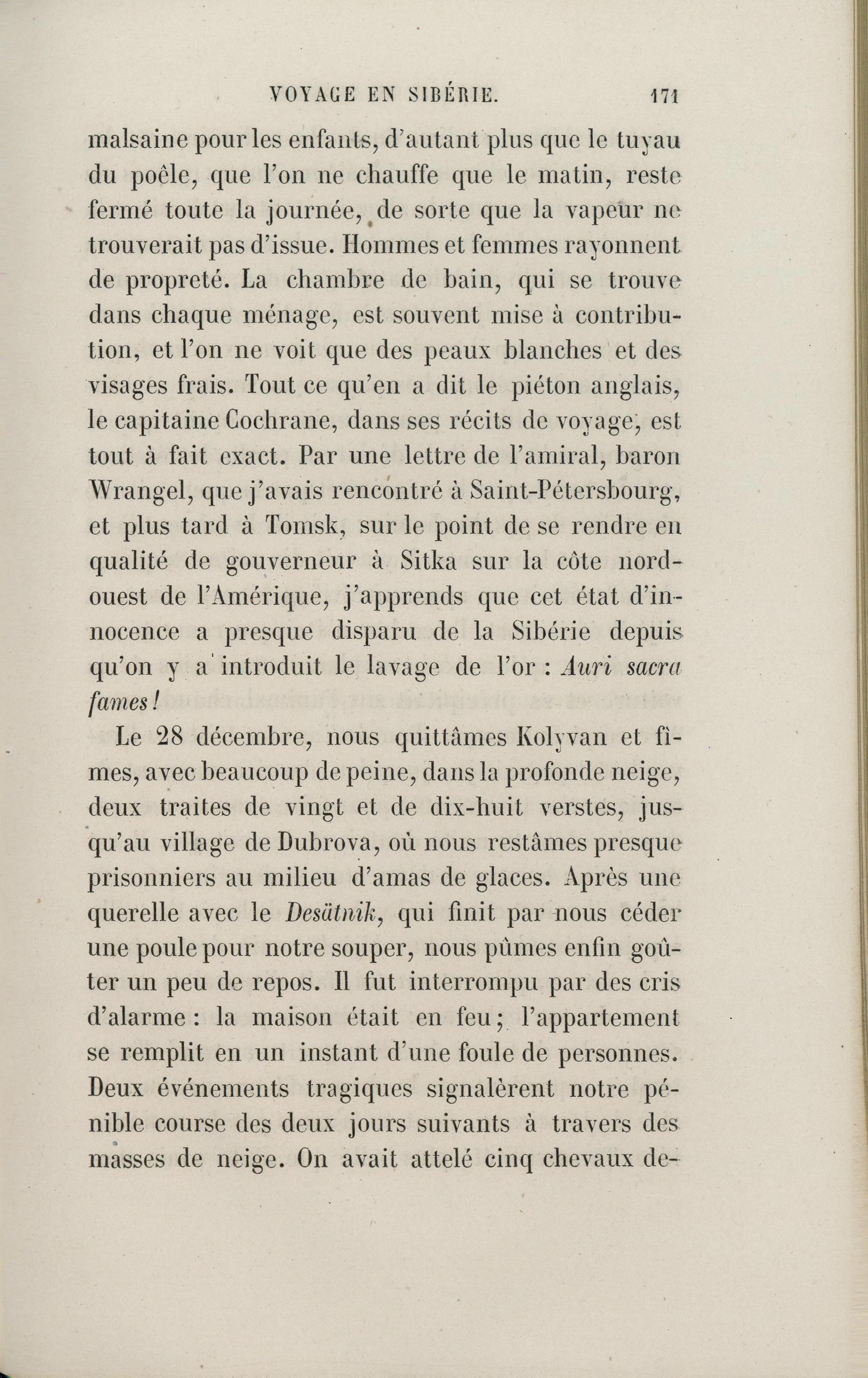 Full resolution (JPEG) - On this page / på denna sida - V. Départ de Tobolsk. — Ivan Schlau. — Course difficile au cœur d’un hiver sibérien. — Honneurs importuns à Kolyvan. — Endurcissement et bonhomie des paysans sibériens. — Accidents malheureux. — Séjour à Tomsk et description du ménage d’un marchand sibérien. — Séjour à Krasnoiarsk. — Le gouverneur Stepanoff. — Schigemune. — Grand froid. — Nielsen en danger de mort