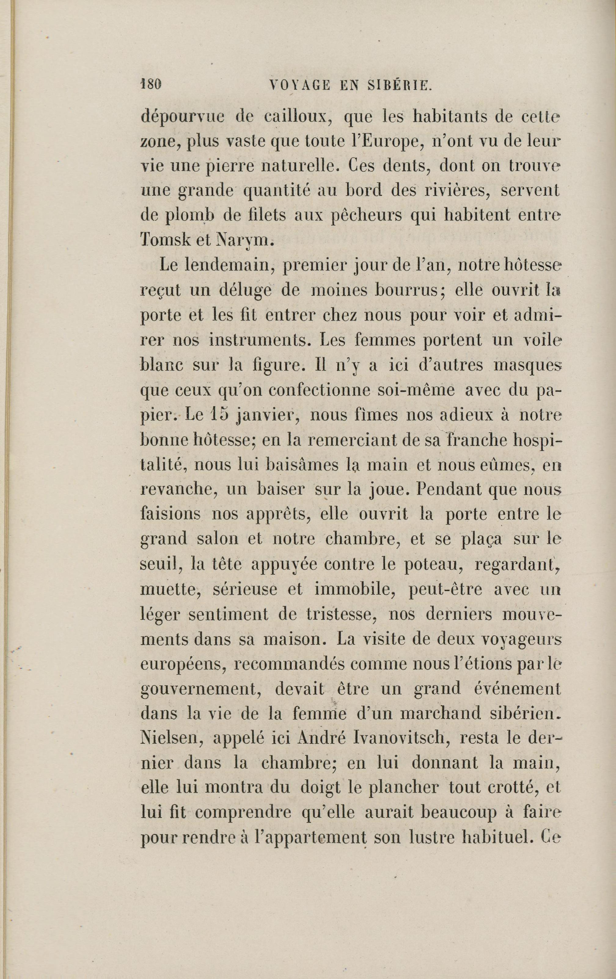 Full resolution (JPEG) - On this page / på denna sida - V. Départ de Tobolsk. — Ivan Schlau. — Course difficile au cœur d’un hiver sibérien. — Honneurs importuns à Kolyvan. — Endurcissement et bonhomie des paysans sibériens. — Accidents malheureux. — Séjour à Tomsk et description du ménage d’un marchand sibérien. — Séjour à Krasnoiarsk. — Le gouverneur Stepanoff. — Schigemune. — Grand froid. — Nielsen en danger de mort