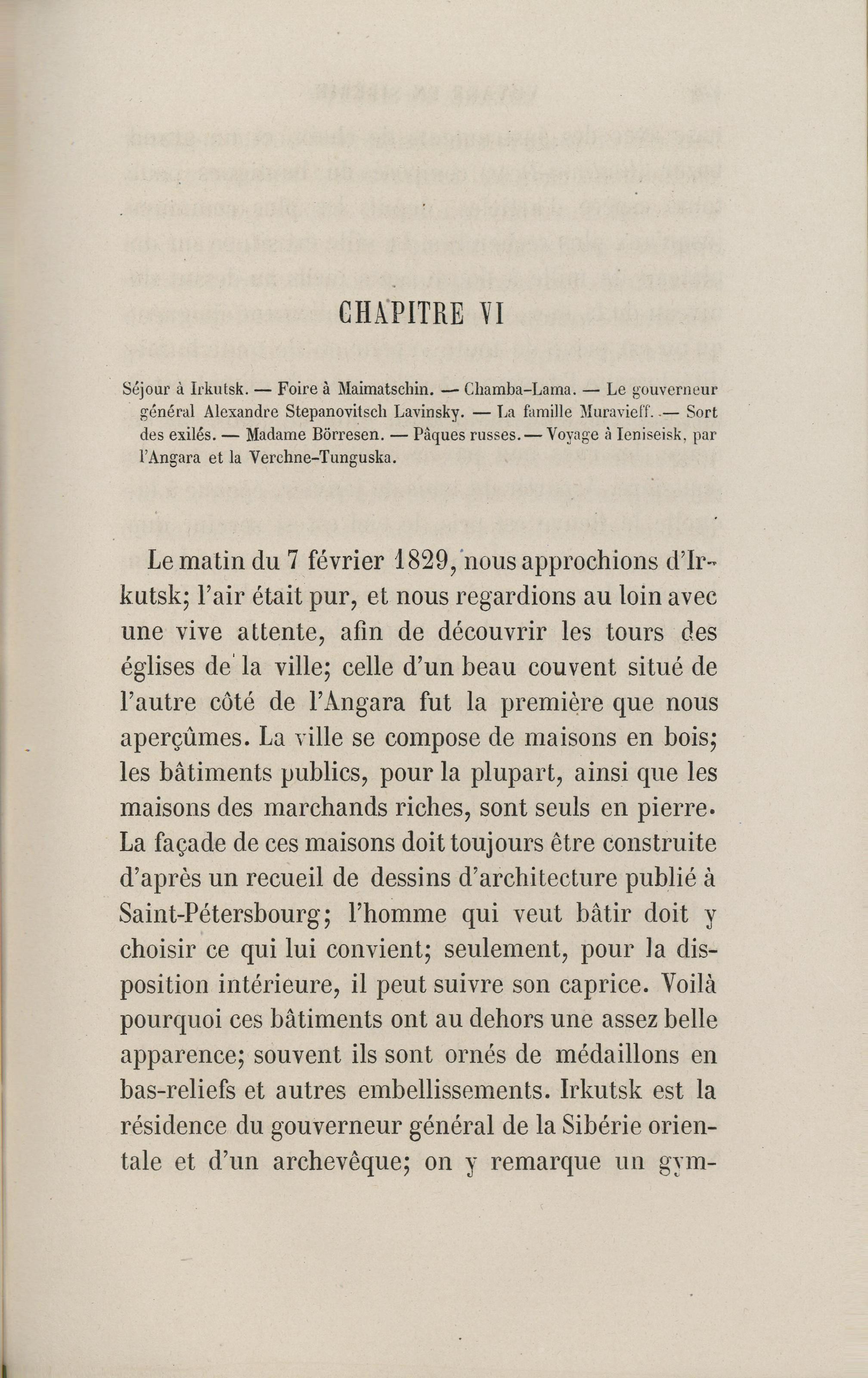 Full resolution (JPEG) - On this page / på denna sida - VI. Séjour à Irkutsk. — Foire à Maimatschin. — Chamba-Lama. — Le gouverneur général Alexandre Stepanovitsch Lavinsky. — La famille Muravieff. — Sort des exilés. — Madame Börresen. — Pâques russes. — Voyage à Ieniseisk, par l’Angara et la Verchne-Tunguska