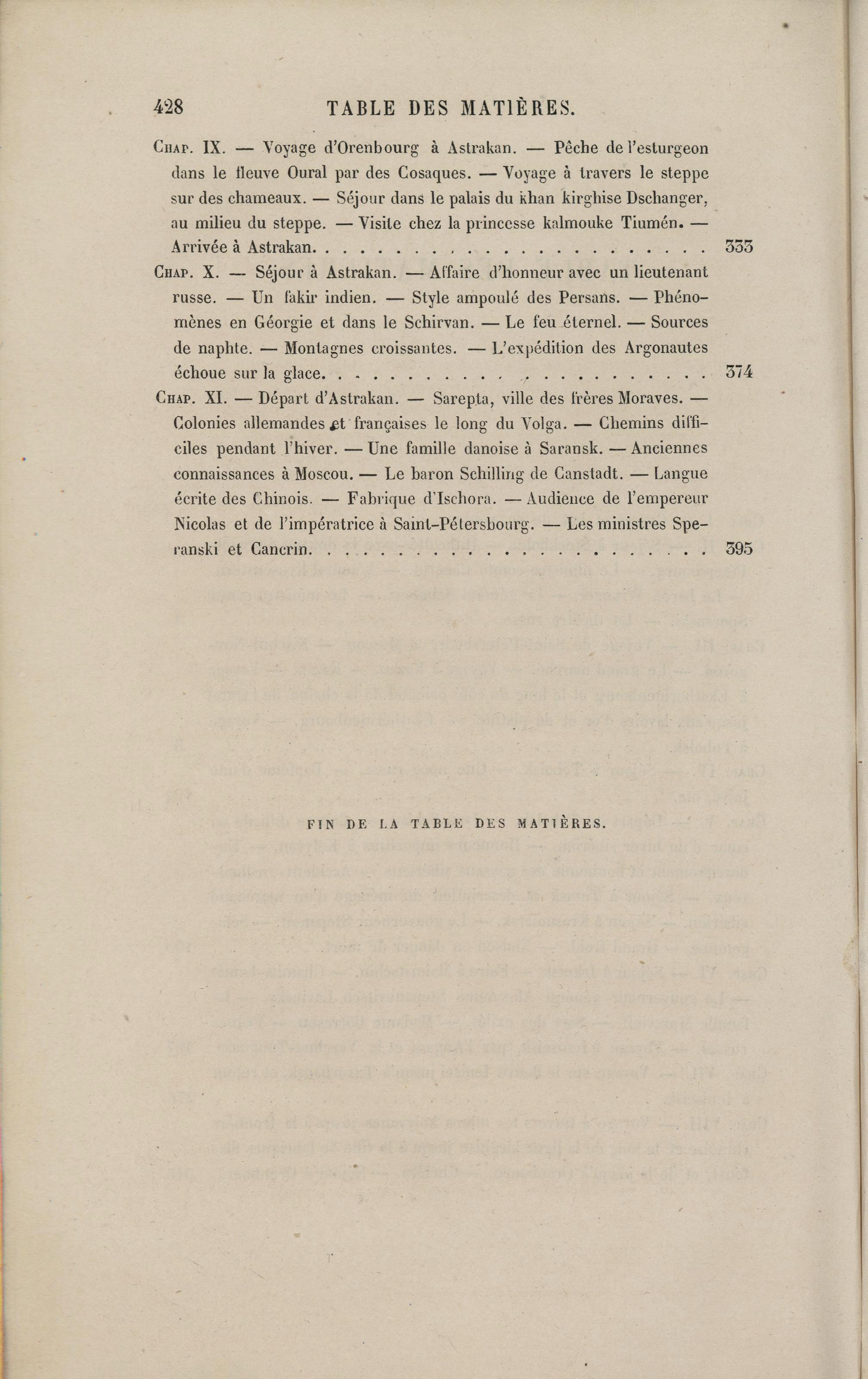 Colonies allemandes et françaises le long du Volga. — Chemins difficiles pendant l’hiver. — Une famille danoise à Saransk. — Anciennes connaissances à Moscou. — Le baron Schilling de Canstadt. — Langue écrite des Chinois. — Fabrique d’Ischora. — Audience de l’empereur Nicolas et de l’impératrice à Saint-Pétersbourg. — Les ministres Speranski et Cancrin | 395 |