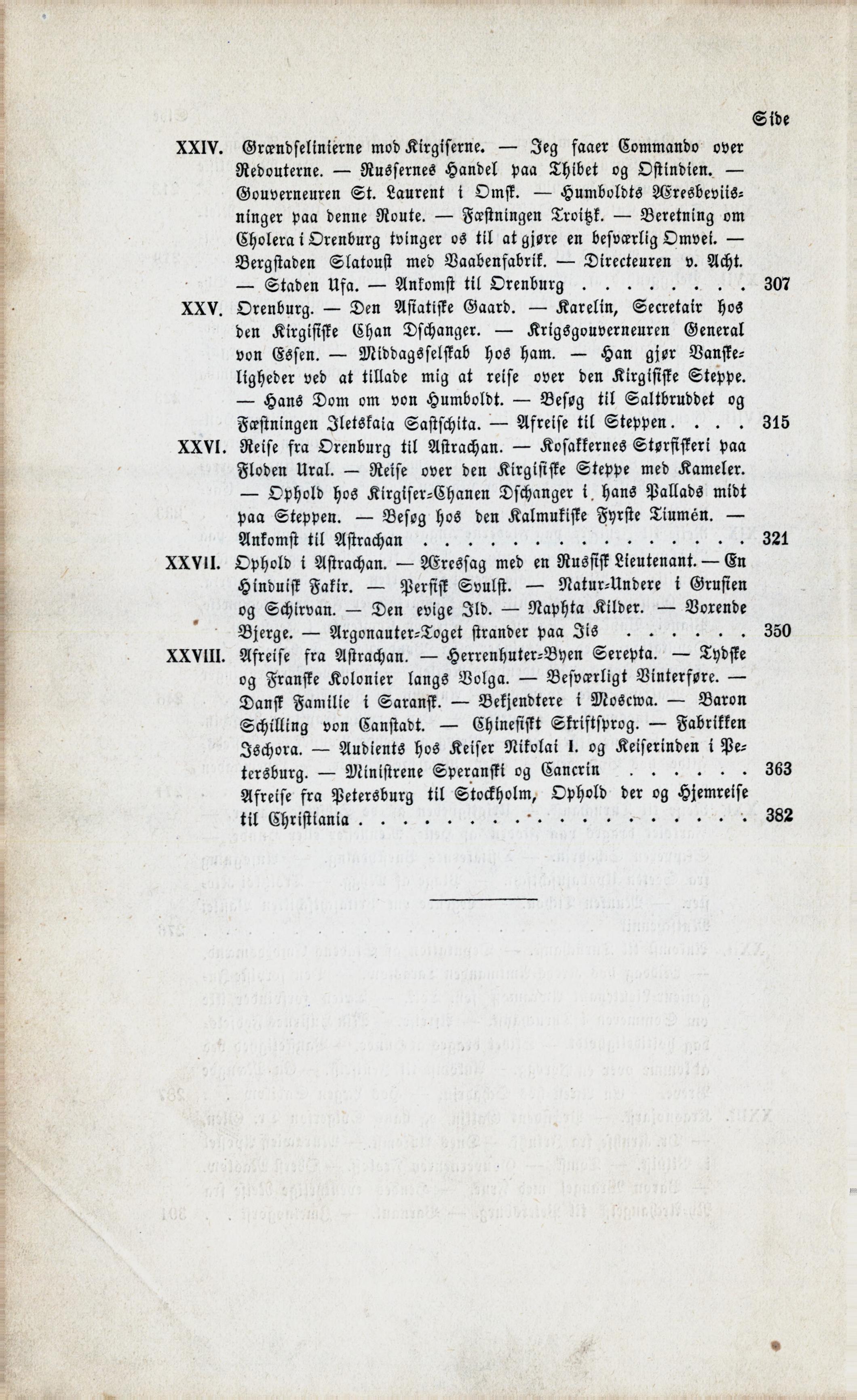 Floden Ural. — Reise over den Kirgisiske Steppe med Kameler. — Ophold hos Kirgiser-Chanen Dschanger i hans Pallads midt paa Steppen. — Besøg hos den Kalmukiske Fyrste Tiumén. — Ankomst til Astrachan | 321 |