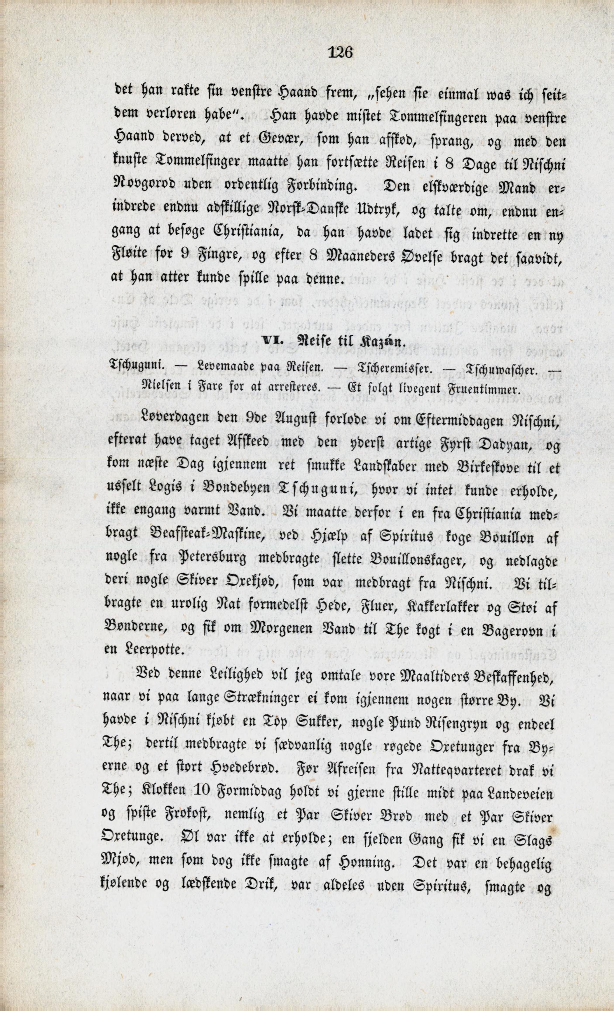 Full resolution (JPEG) - On this page / på denna sida - V. Reise til Nischni Novgorod. — Slette Veie. — Uveir. — Strid med en gammel adelig Dame i Sudogda. — Murom. — Landsbyen Doskino. — Logis hos en Pope. — Nischni Novgorod. — Det store aarlige Marked. — Besøg i en Moschée. — Handel med Madame Lebours. — Udlændiger ville med Flid ikke tale Russiskt correct. — Knäs Dabyan. — Savn af Beqvemmeligheder i Hotellerne. — Selskab hos Gouverneuren, General Bachmetieff. — Fløitespilleren Walter - VI. Reise til Kazán. — Tschuguni. — Levemaade paa Reisen. — Tscheremisser. — Tschuwascher. — Nielsen i Fare for at arresteres. — Et solgt livegent Fruentimmer