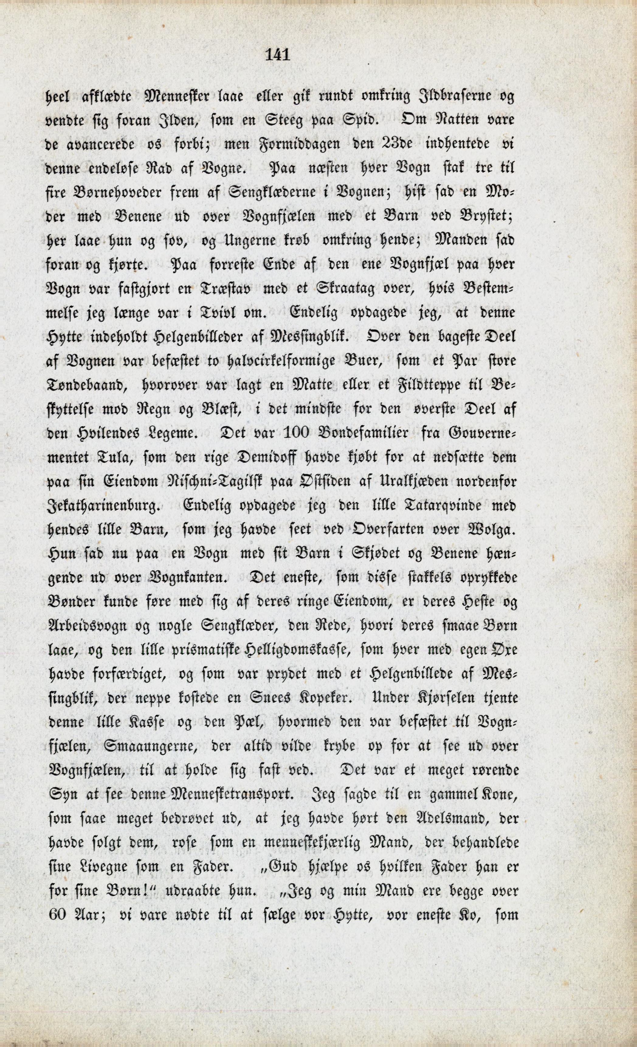 Full resolution (JPEG) - On this page / på denna sida - VIII. Reise til Jekatharinenburg. — Gjestfrihed i Malmisch. — Wotiäker. — Livegne solgte fra et Gods i Tula til Fabriken Nischni-Tagilsk i Ural. — Forhindret Grusomhed mod en Qvinde i Dubrowa. — Perm. — Hurtig Kjørsel i Rusland. — Russiskt Dampbad. — Den magnetiske Intensitets Tilvæxt ved Nærmelsen til den Sibiriske Magnetpol. — Transport af Forviiste. — Festlighed ved Indtog i Asien. — Ankomst til Jekatharinenburg