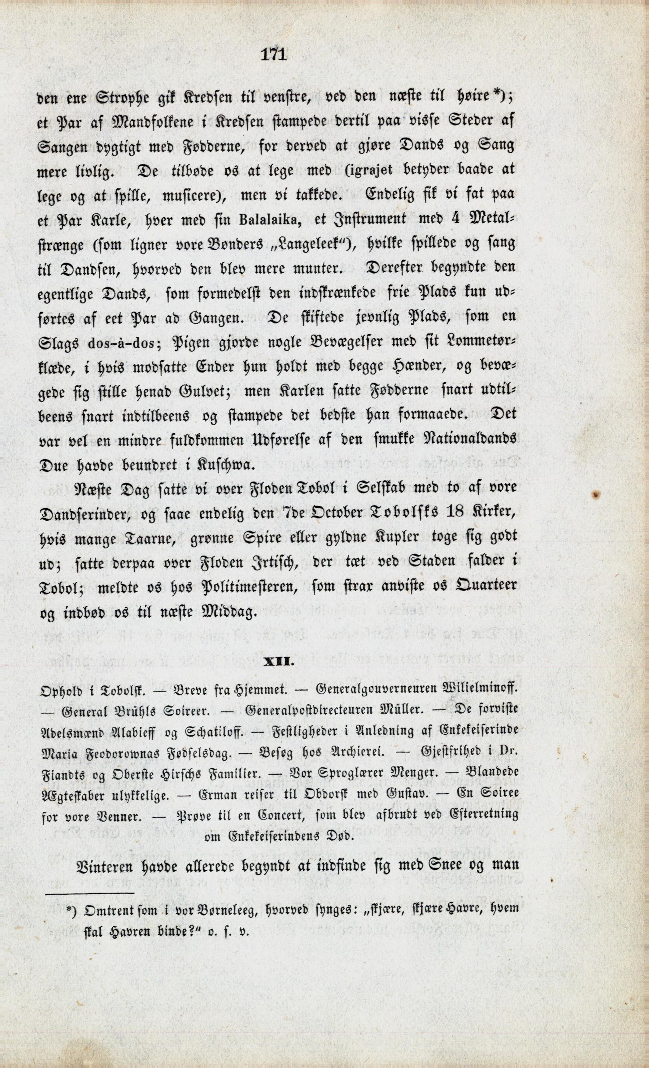 Full resolution (JPEG) - On this page / på denna sida - XI. Reise til Tobolsk. — Besøg af Kjøbmand Sinil. — Middag hos ham i Tiumén. — Archimandriten. — Landsbyen Juschakova. — Gammeltroende. — Bondedands der. — Ankomst til Tobolsk - XII. Ophold i Tobolsk. — Breve fra Hjemmet. — Generalgouverneuren Wilielminoff. — General Brühls Soireer. — Generalpostdirecteuren Müller. — De forviste Adelsmænd Alabieff og Schatiloff. — Festligheter i Anledning af Enkekeiserinde Maria Feodorownas Fødselsdag. — Besøg hos Archierei. — Gjestfrihed i Dr. Fiandts og Oberste Hirschs Familier. — Vor Sproglærer Menger. — Blandede Ægteskaber ulykkelige. — Erman reiser til Obdorsk med Gustav. — En Soiree for vore Venner. — Prøve til en Concert, som blev afbrudt ved Efterretning om Enkekeiserindens Død