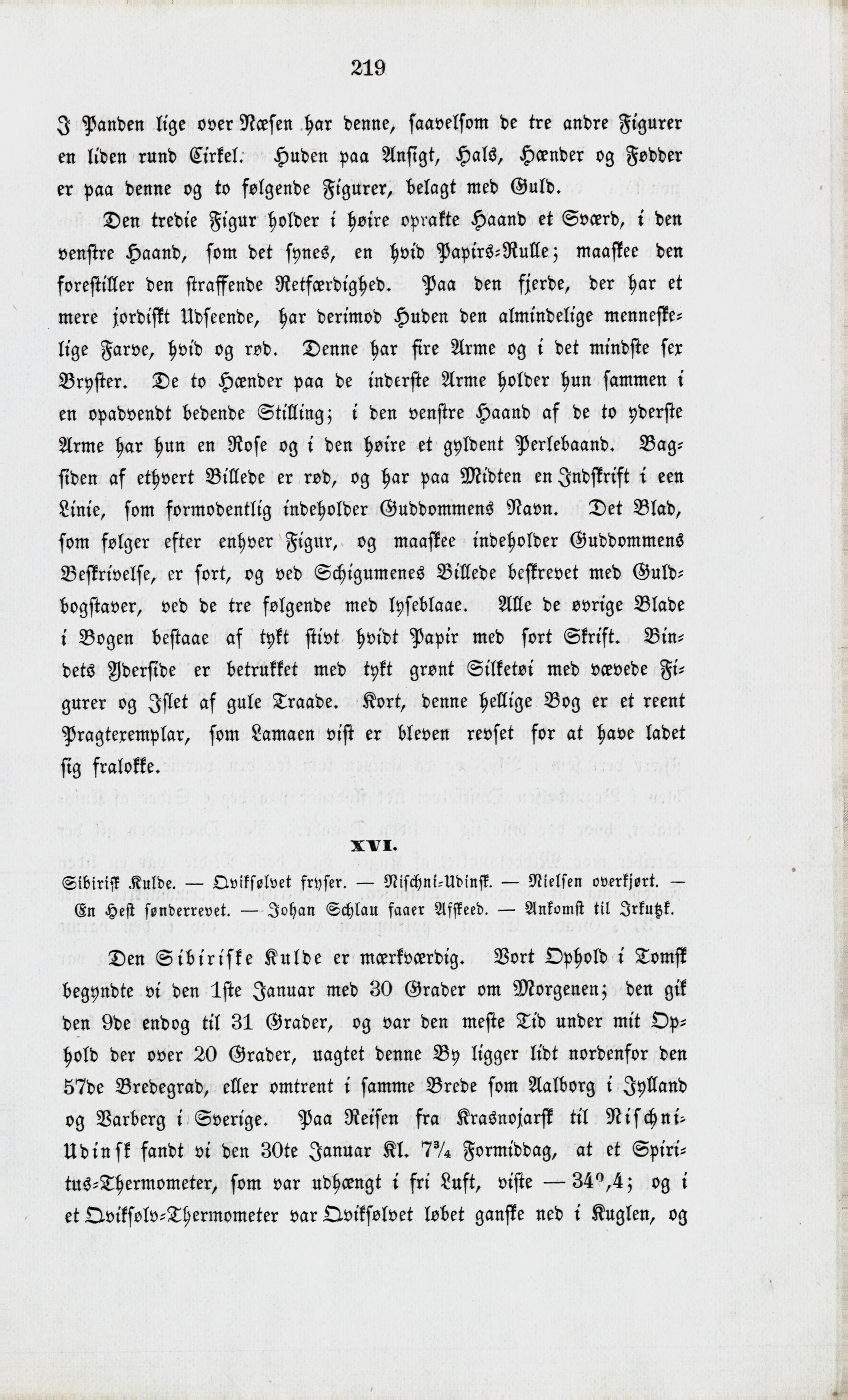 Full resolution (JPEG) - On this page / på denna sida - XV. Gjestfri Modtagelse i Atschinsk. — Indtrædelse i det østlige Sibirien. — Krasnojarsk. — Gouverneuren Stepanow. — Hans Kunst- og Naturalie-Samlinger. — Hans Gjestfrihed. — Forslag at reise til Turuchansk. — Tungusisk Schaman. — Den Mongoliske Skytsgud Schigemune. — Buddaismen - XVI. Sibirisk Kulde. — Qviksølvet fryser. — Nischni-Udinsk. — Nielsen overkjørt. — En Hest sønderrevet. — Johan Schlau faaer Afsked. — Ankomst til Irkutzk