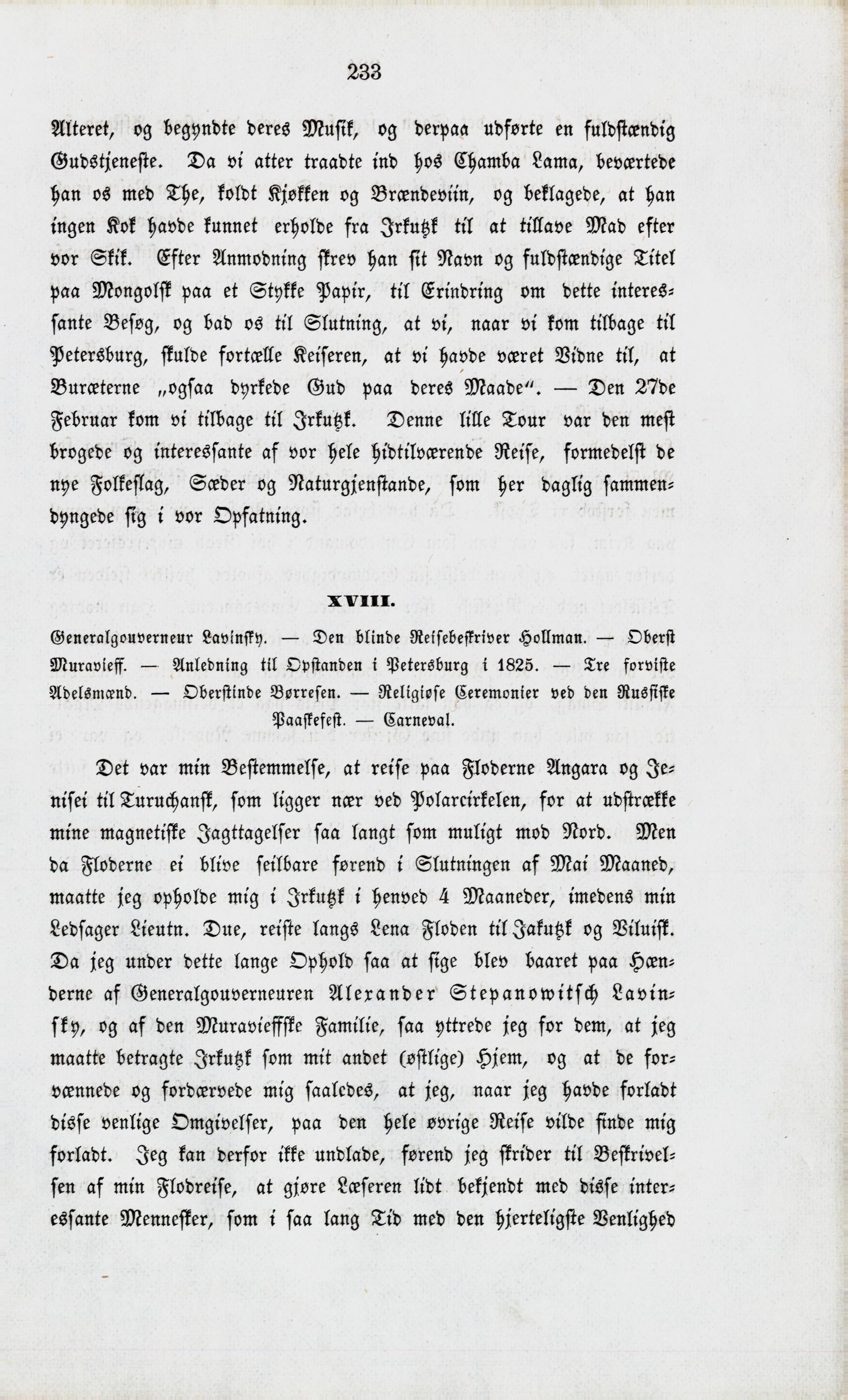 Full resolution (JPEG) - On this page / på denna sida - XVII. Beliggenhed af Irkutzk, det østlige Sibiriens Hovedstad. — Byfogden Oberst Muravieff. — Middag hos den Baikalske Admiral. — Reise over Baikal til Troitzko-Savsk. — Den Chinesiske Grændseby Maimatschin. — Festlig Middag hos den Chinesiske Sargutschei (Gouverneur). — Lamaisk Gudstjeneste, foranstaltet af Chamba Lama, nær Selenginsk - XVIII. Generalgouverneur Lavinsky. — Den blinde Reisebeskriver Hollman. — Oberst Muravieff. — Anledning til Opstanden i Petersburg i 1825. — Tre forviste Adelsmænd. — Oberstinde Børresen. — Religiøse Ceremonier ved den Russiske Paaskefest. — Carneval
