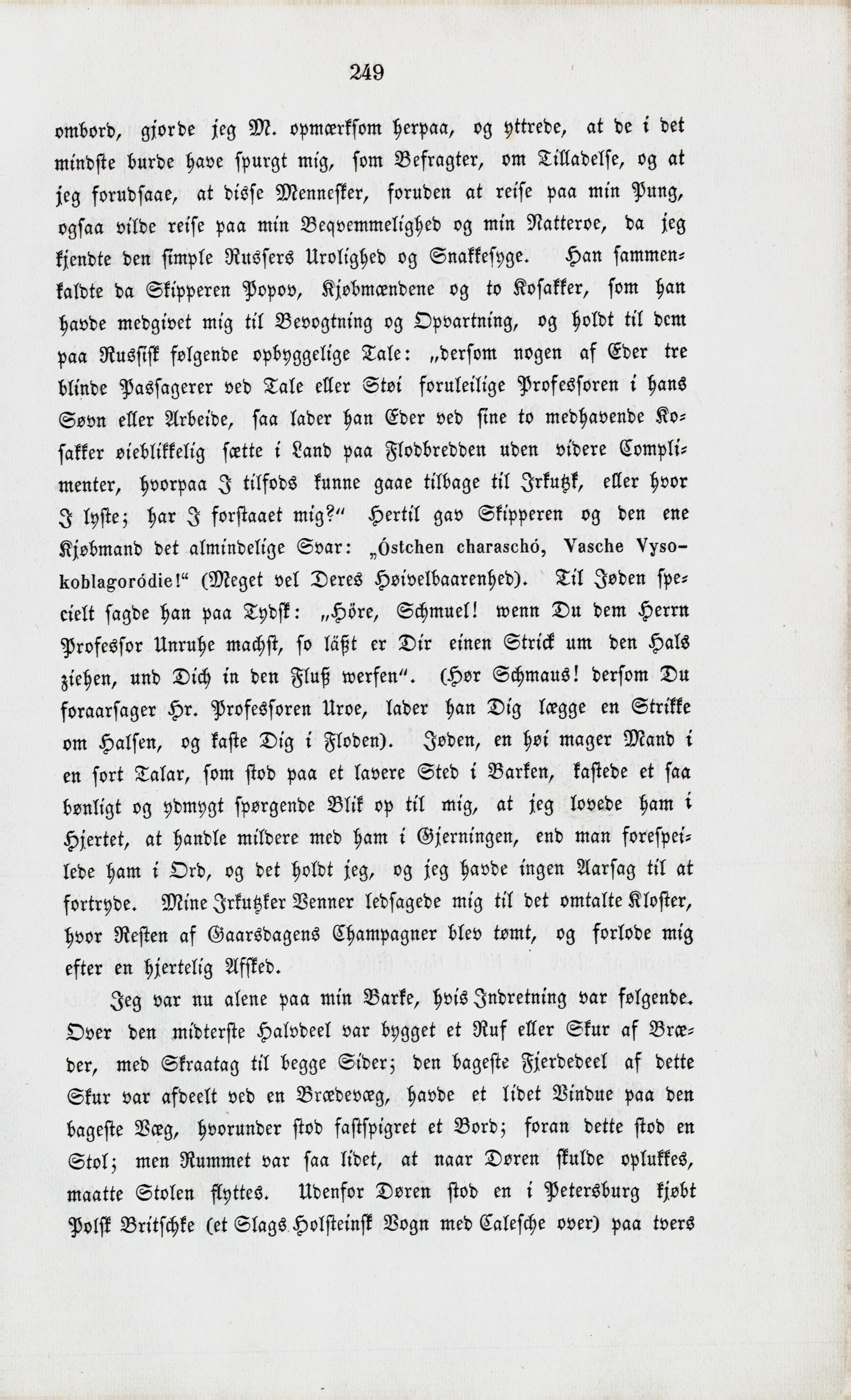 Full resolution (JPEG) - On this page / på denna sida - XIX. Reise til Jeniseisk paa Floderne Angara og Werchne-Tunguska paa Barken Dóbroje Namérenïe. — Afsked fra Lavinsky og Muravieffs Familie. — Blinde Passagerer paa Barken. — Jøden Schmerka. — Gustavs Charakteristik. — Nedfart over Fossene Pochmelie, Pianoi, Buyk og Padun. — Assessor Komlevsky i Keschemy. — Deputation med Foræringer fra Bønderne i Tschadobetz. — Strænge Jødiske Afholdenheds-Regler. — Gustavs Forelæsninger af Walter Scots Ivanhoe. — Ankomst til Jeniseisk