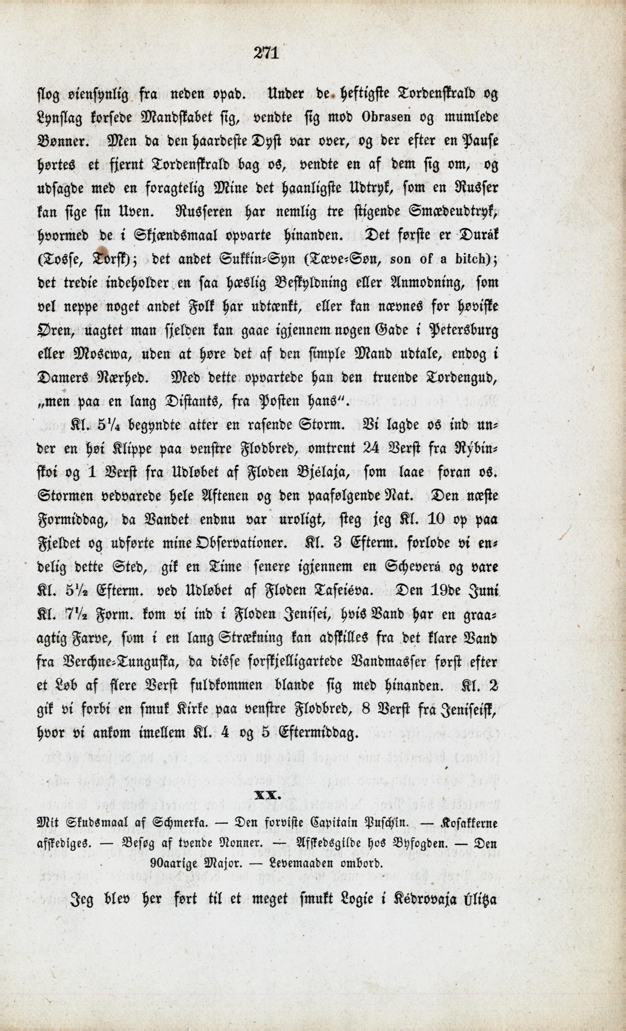 Full resolution (JPEG) - On this page / på denna sida - XIX. Reise til Jeniseisk paa Floderne Angara og Werchne-Tunguska paa Barken Dóbroje Namérenïe. — Afsked fra Lavinsky og Muravieffs Familie. — Blinde Passagerer paa Barken. — Jøden Schmerka. — Gustavs Charakteristik. — Nedfart over Fossene Pochmelie, Pianoi, Buyk og Padun. — Assessor Komlevsky i Keschemy. — Deputation med Foræringer fra Bønderne i Tschadobetz. — Strænge Jødiske Afholdenheds-Regler. — Gustavs Forelæsninger af Walter Scots Ivanhoe. — Ankomst til Jeniseisk - XX. Mit Skudsmaal af Schmerka. — Den forviste Capitain Puschin. — Kosakkerne afskediges. — Besøg af tvende Nonner. — Afskedsgilde hos Byfogden. — Den 90aarige Major. — Levemaaden ombord