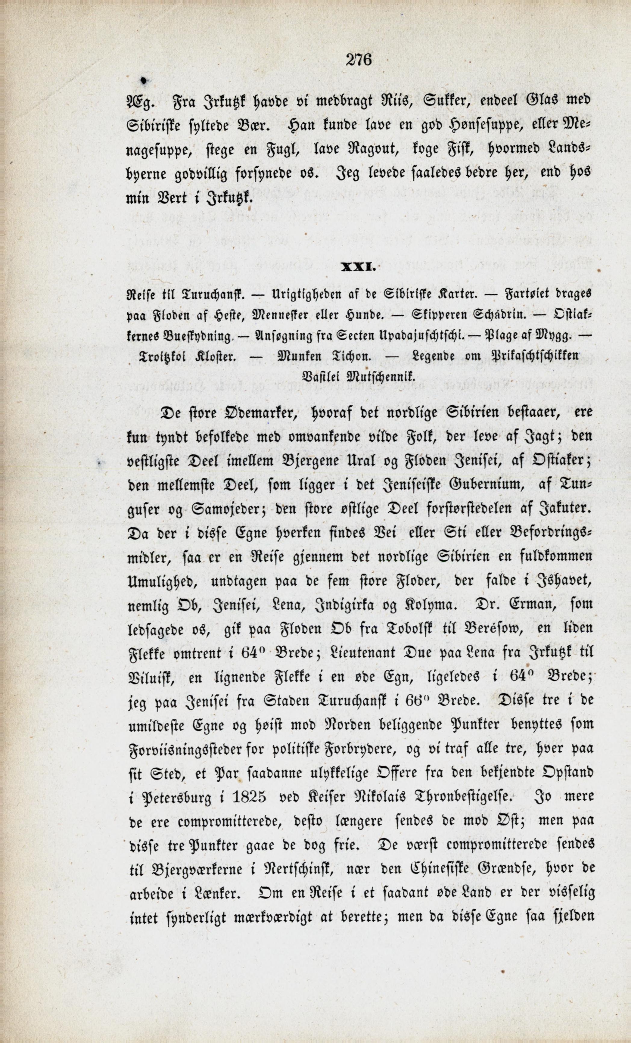 Full resolution (JPEG) - On this page / på denna sida - XX. Mit Skudsmaal af Schmerka. — Den forviste Capitain Puschin. — Kosakkerne afskediges. — Besøg af tvende Nonner. — Afskedsgilde hos Byfogden. — Den 90aarige Major. — Levemaaden ombord - XXI. Reise til Turuchansk. — Urigtigheden af de Sibiriske Karter. — Fartøiet drages paa Floden af Heste, Mennesker eller Hunde. — Skipperen Schadrin. — Ostiakernes Bueskydning. — Ansøgning fra Secten Upadajuschtschi. — Plage af Mygg. — Troitzkoi Kloster. — Munken Tichon. — Legende om Prikaschtschikken Vasilei Mutschennik