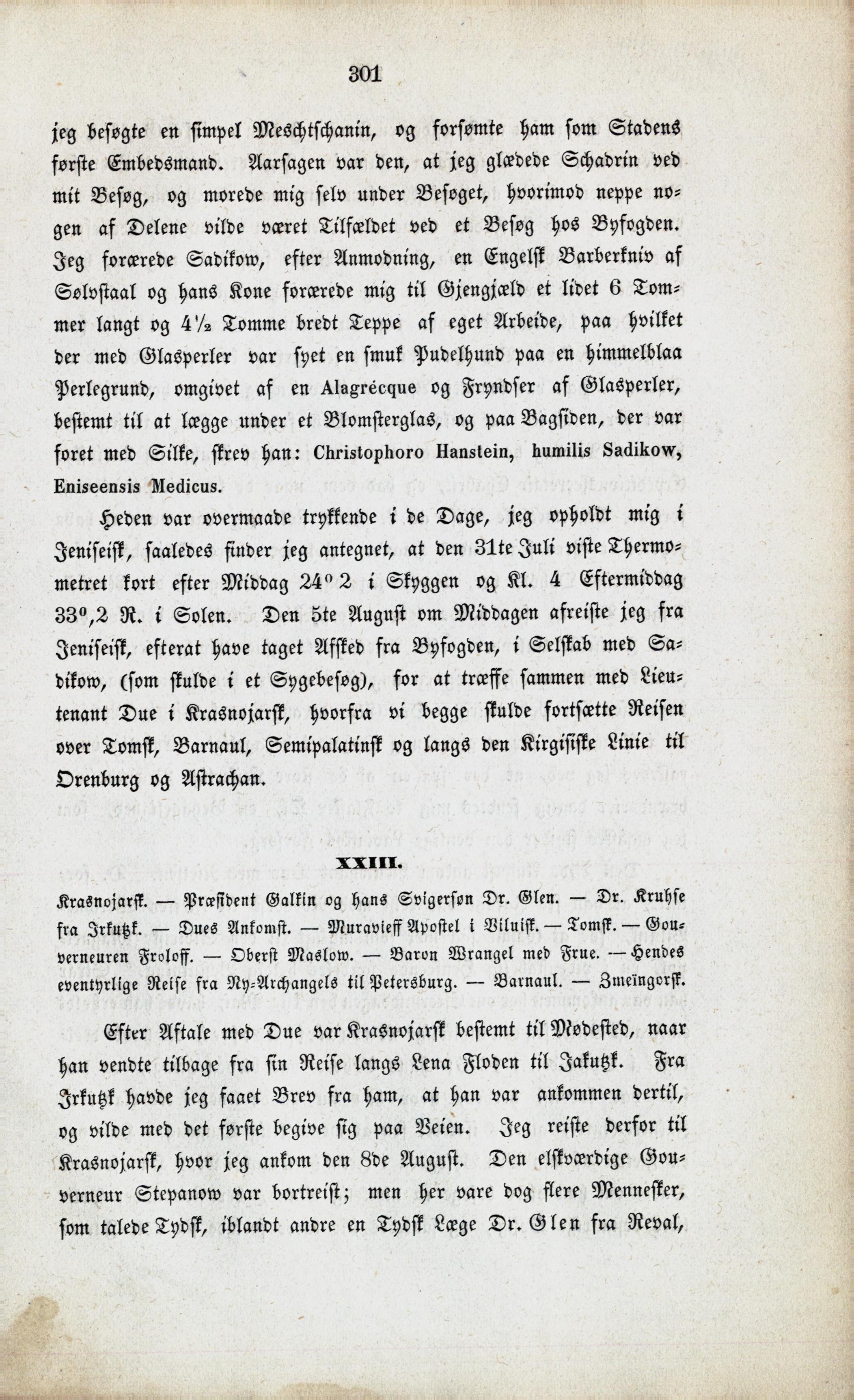 Full resolution (JPEG) - On this page / på denna sida - XXII. Ankomst til Turuchansk. — Deputation af Stadens Embedsmænd. — Middag hos Kreds-Amtmanden Tarassow. — Den forviste Ingenieur-Lieutenant Awramoff som Tolk. — Tælen forsvinder ikke om Sommeren i Turuchansk. — Afreise. — Min Hustrues Fødselsdag høitideligholdt. — Skibet drages af Hunde. — Vanskelighed ved at komme over en Porog. — Ankomst til Jeniseisk. — En Mængde Breve. — En Aften hos Schadrin. — Hos Lægen Sadikow - XXIII. Krasnojarsk. — Præsident Galkin og hans Svigersøn Dr. Glen. — Dr. Kruhse fra Irkutzk. — Dues Ankomst. — Murawieff Apostel i Viluisk. — Tomsk. — Gouverneuren Froloff. — Oberst Maslow. — Baron Wrangel med Frue. — Hendes eventyrlige Reise fra Ny-Archangelsk til Petersburg. — Barnaul. — Zmeïnogorsk