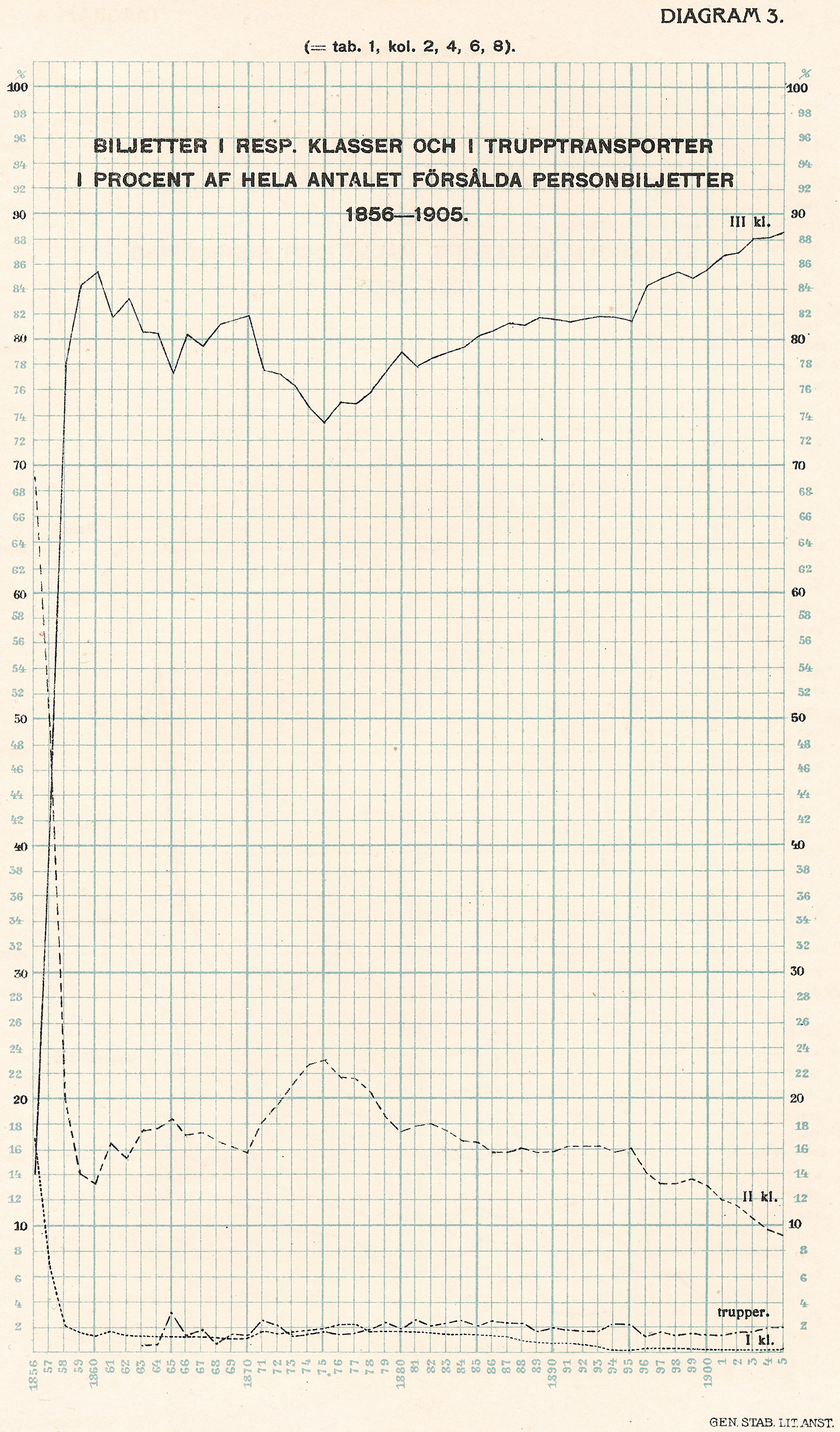 Full resolution (JPEG) - On this page / på denna sida - Statistisk historik. Af Milkontrollören G. A. H. d'Ailly - Diagram 3. Biljetter i resp. klasser och i trupptransporter i procent af hela antalet försålda personbiljetter 1856-1905